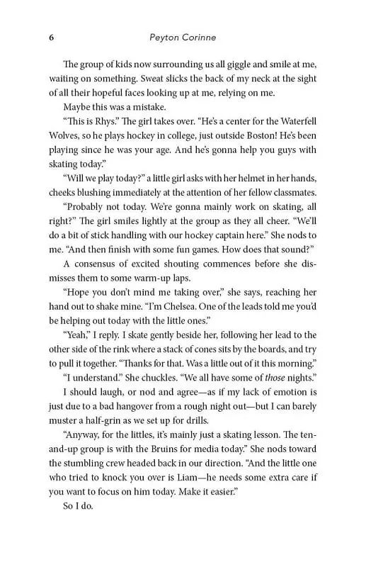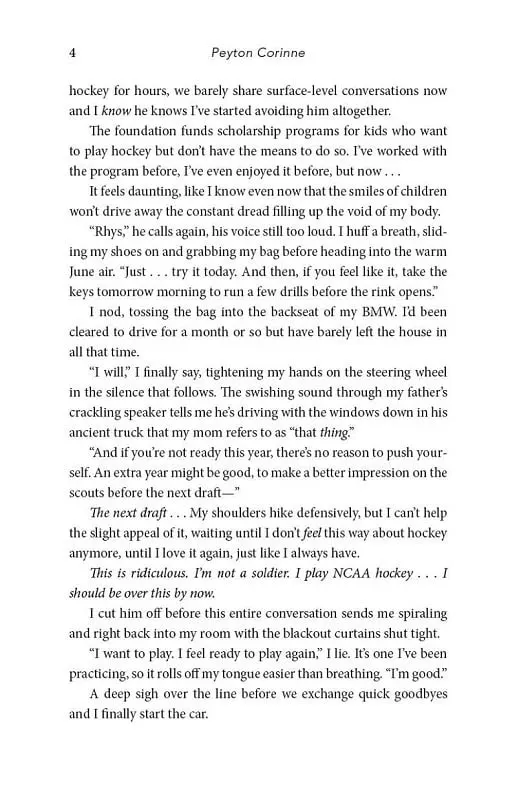 *THE TIKTOK SENSATION*'Unputdownable and unforgettable. Peyton Corinne effortlessly weaves together raw, emotional moments with scenes that feel like a warm embrace through dynamic characters that will leave an indelible imprint long after you turn the final page' Bal Khabra, author of CollideRhys is desperate to feel anything.Sadie wants to stop feeling so much.Rhys Koteskiy is back—at least, he’s supposed to be. During last year’s Frozen Four, the Waterfell University hockey captain and NHL legacy took a brutal hit that left him with a concussion and a new discomfort on the ice. Plagued by nightmares and panic attacks every time he attempts to skate, Rhys wonders if he’ll ever play again—or if he’ll ever want to.Sadie Brown is staying focused this semester—no matter what. Currently drowning in debt, custody hearings for her younger brothers, and skating practices, she’s just trying to make it to the next day. A spitfire figure skater known for her bad attitude and frequent disappearing acts, Sadie has a reputation on campus. And it’s not a pretty one.When she accidentally witnesses one of the golden boy hockey captain’s panic attacks and attempts to help him, a strange sort of understanding strikes up between them. No questions asked. Just comfort. But Rhys finds himself drawn to Sadie. Where he feels empty, a shell of the man and player he was before, Sadie is so full of everything, it bursts from her; every emotion she feels seems like it’s blasted at max volume. Rhys is desperate to feel anything. Sadie wants to stop feeling so much. But healing doesn’t mix with secrets, and they’re both skating on thin ice.