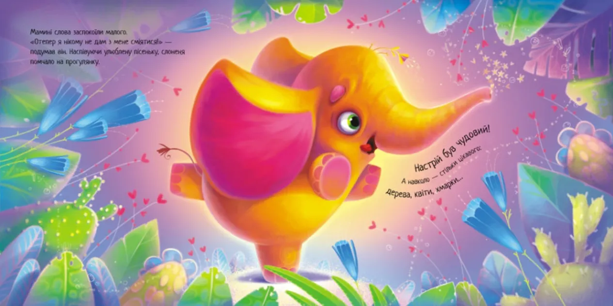 Це історія про слоника, який уперше вирушив гуляти без мами. Він був радий і почувався дуже дорослим. Але звірі, яких він зустрічав, насміхалися зі слоненяти, адже в нього такий довгий ніс, великі вуха й саме воно чималеньке. Слоненя так засмутилося... Добре, що мама знає, як розповісти малюкові, що бути слоном дуже гарно!