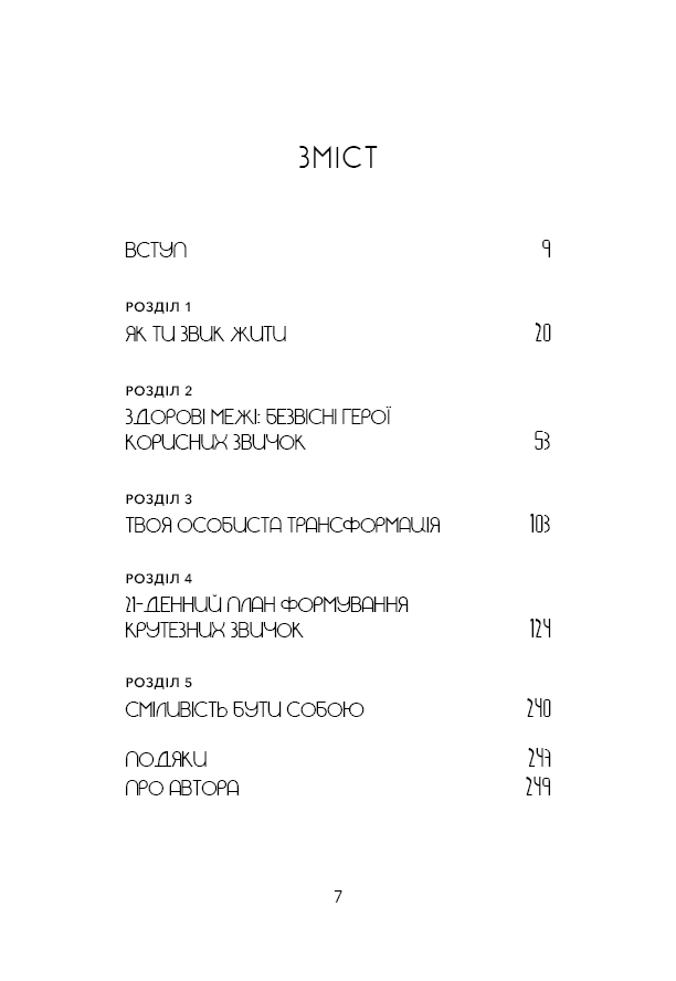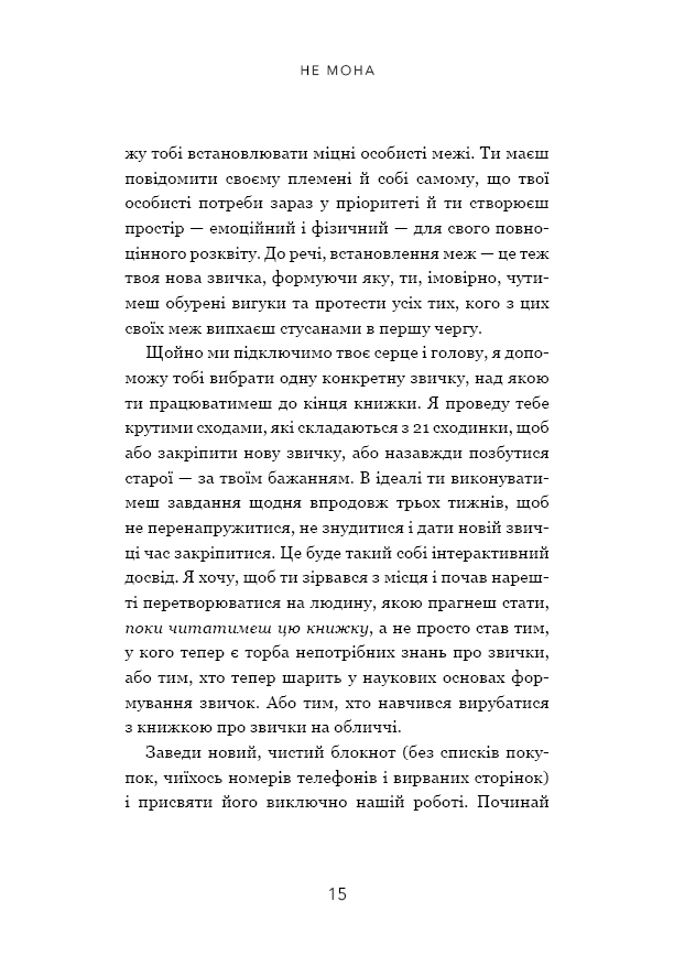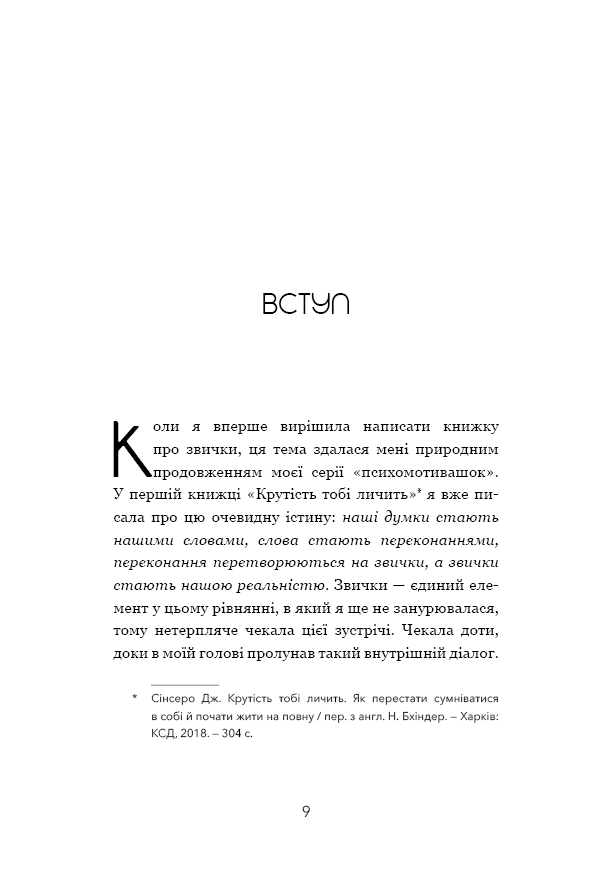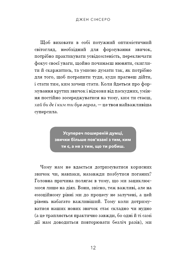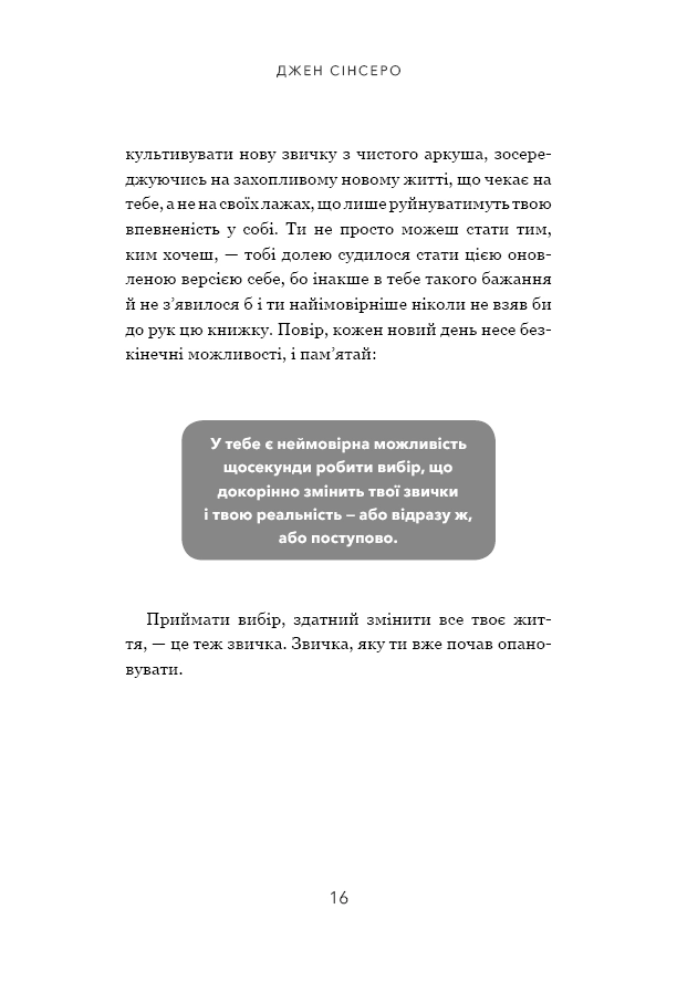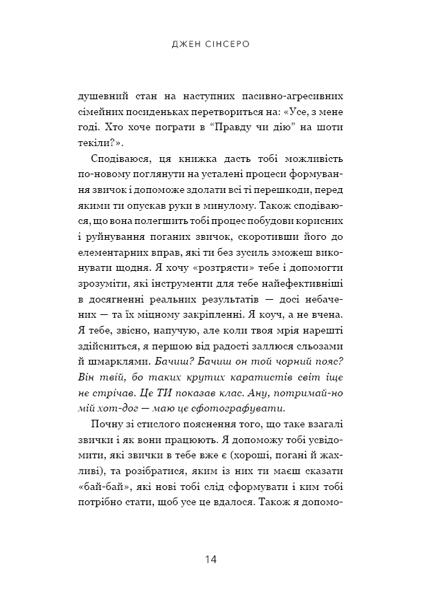 Джен Сінсеро — авторка бестселерів і мотиваційний коуч — переконана: наші думки стають словами, наші слова стають переконаннями, наші переконання перетворюються на звички, а наші звички стають нашою реальністю. Нова книга авторки присвячена останньому й найскладнішому кроку цього ланцюжка — звичкам. Як зробити так, щоб позбутися поганих звичок і замінити їх хорошими? У своїй дотепній манері Джен Сінсеро не лише доступно пояснює це, а й мотивує читача розпочати 21-денну програму, яка допоможе зрештою змінити життя.