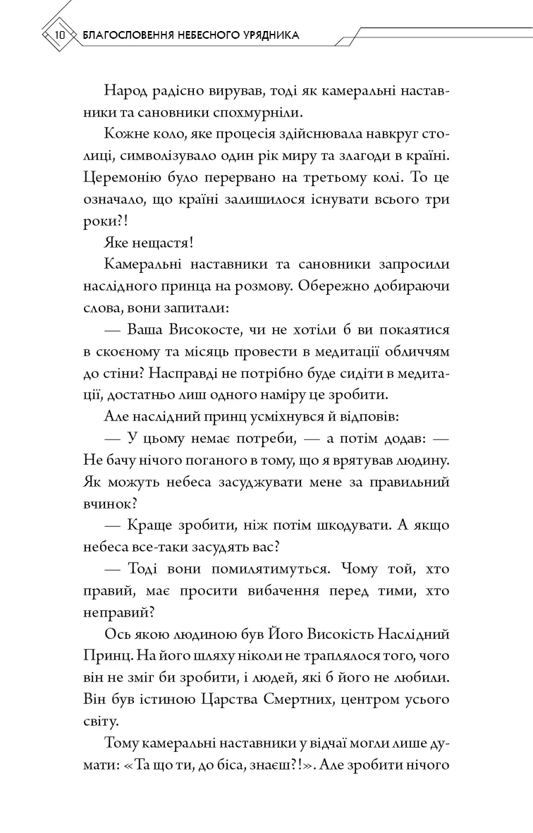 "Благословення Небесного Урядника" — це захоплюючий фентезійний роман, що переносить читачів у світ магії та таємниць. Головний герой, Сє Лянь, спадкоємний принц королівства Сяньле, стає божественною істотою завдяки своїм добрим вчинкам. Проте після падіння з небес він повертається до світу смертних.