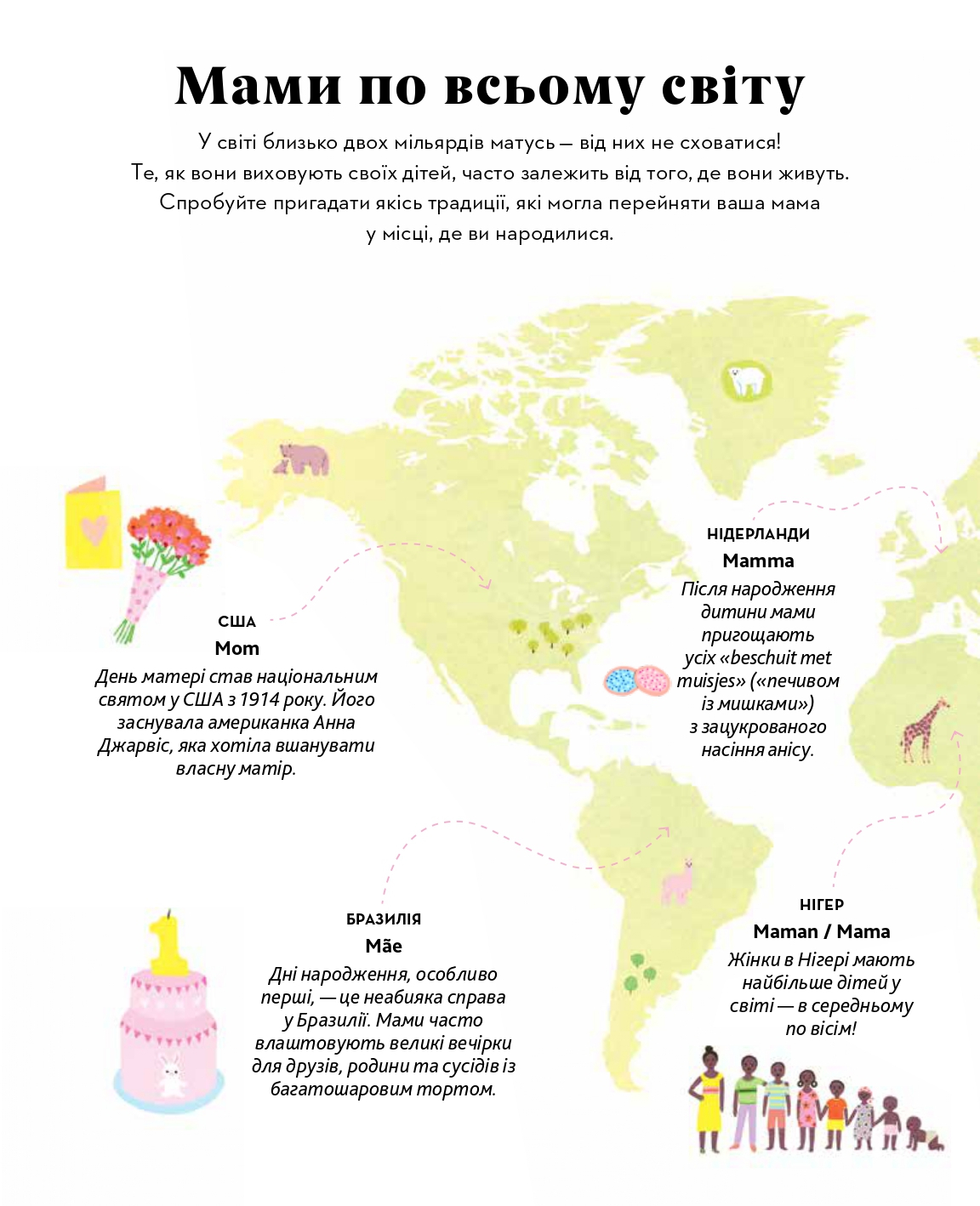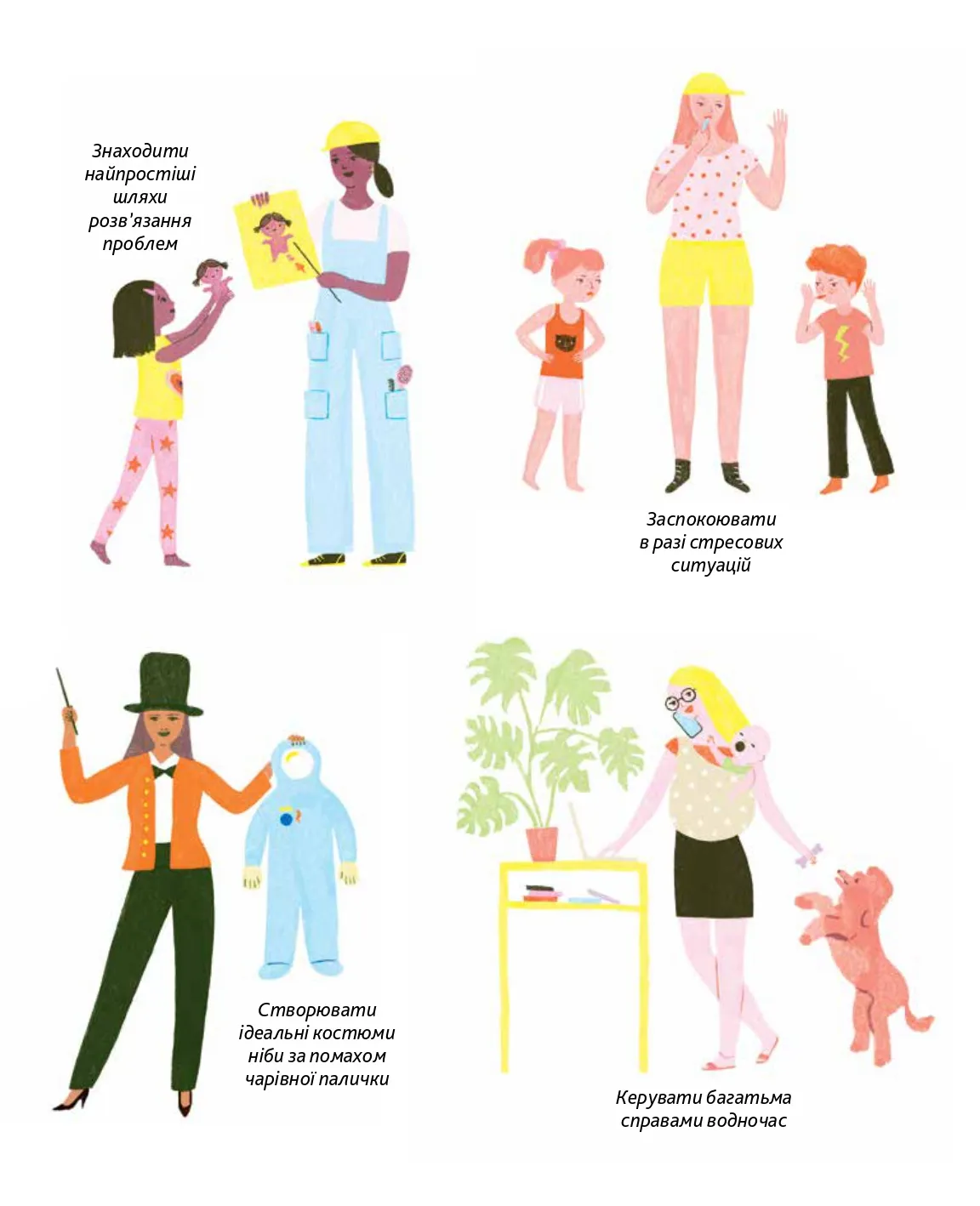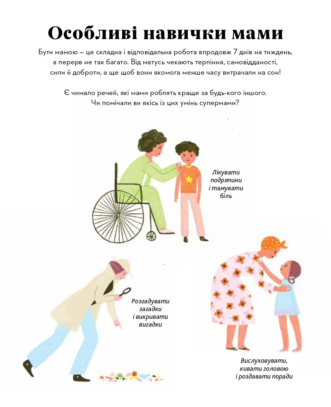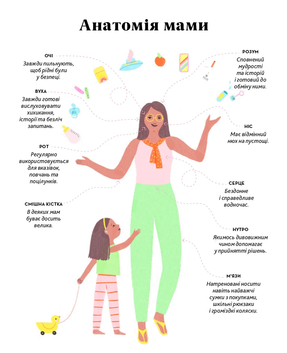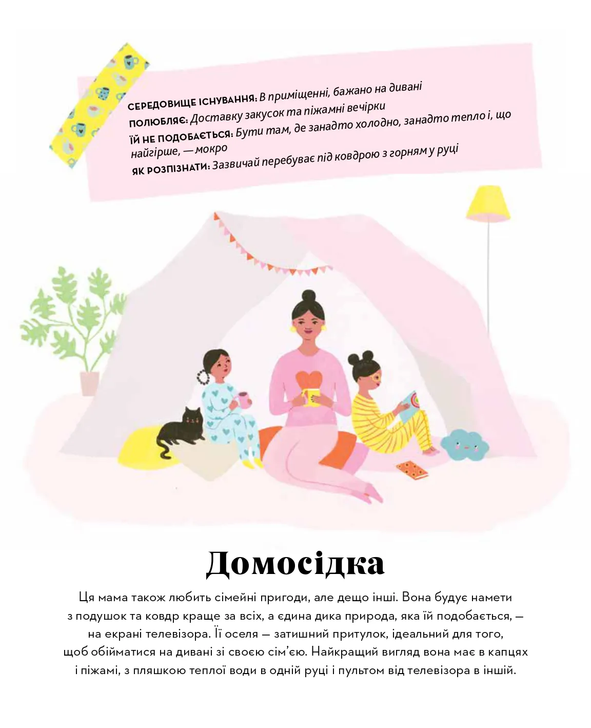 Знаєте, хто може одночасно вправно виконувати кілька, здавалося б, нездійсненних завдань і при цьому мати бездоганний (ну, майже) вигляд? Звичайно ж, мама!З цієї книги ви дізнаєтеся, хто такі мами, якими особливими навичками вони володіють і де їх можна зустріти. Існує чимало різних мам, і у кожної свої уподобання, антипатії та середовище існування.Від любительки природи, яка обожнює свіже повітря, і балакучої мами, яка на кожен випадок має напохваті історію, до мами-бунтарки, яка ніколи в житті не читає жодних інструкцій, — мами можуть бути дуже різними, але всі вони по-своєму чудові.Можливо, на сторінках цієї книги ви когось упізнаєте?