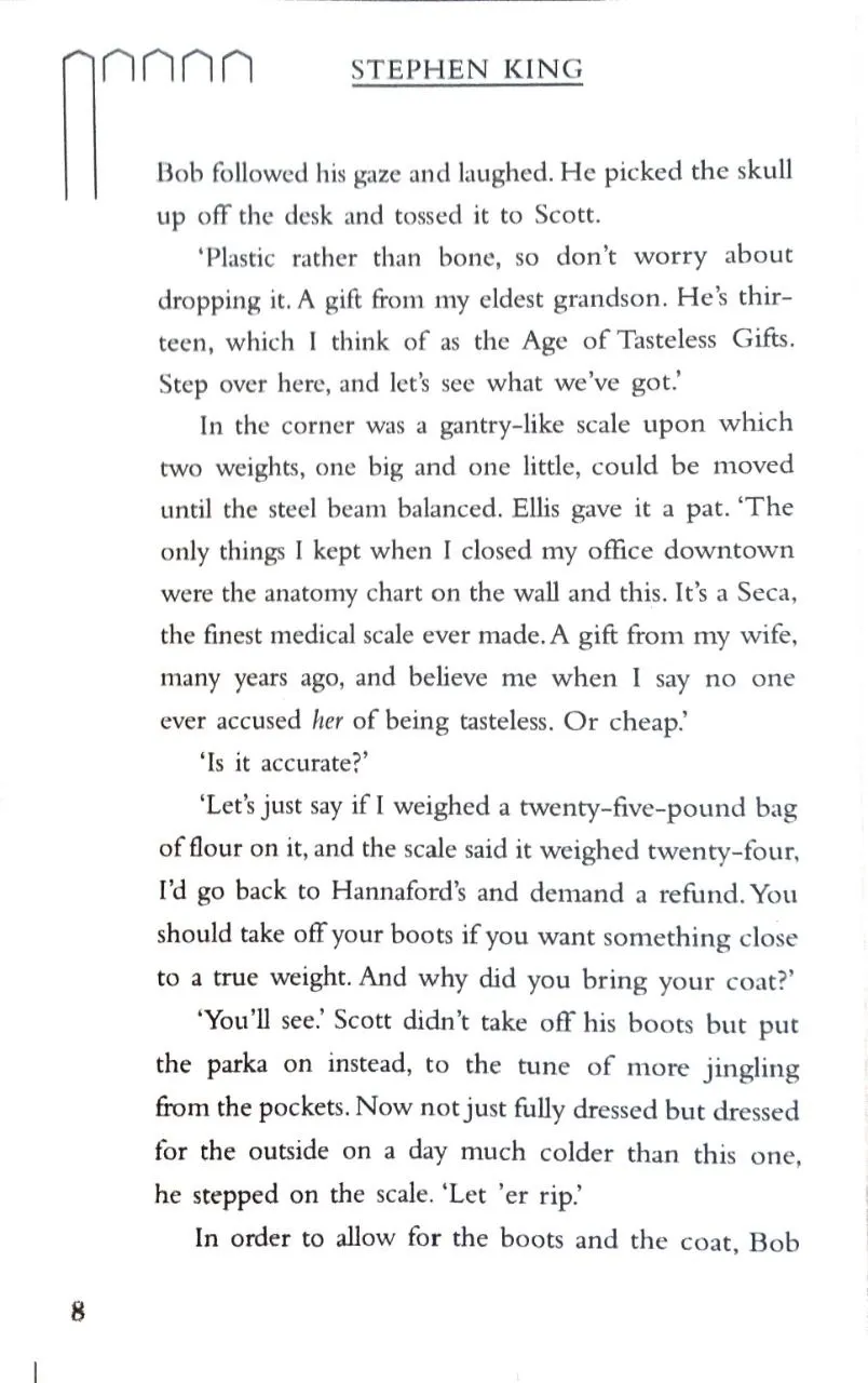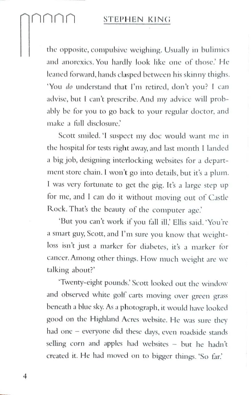 From the ultimate storyteller Stephen King comes, a 'joyful, uplifting' (Entertainment Weekly) tale about finding common ground despite deep-rooted differences, now with a new cover look. In the small town of Castle Rock word gets around quickly. That's why Scott Carey only confides in his friend Doctor Bob Ellis about his strange condition. Every day he's losing weight - but without looking any different. Meanwhile a new couple, Deirdre and Missy, owners of a 'fine dining experience' in town, have moved in next door. Scott is not happy that their dogs keep fouling on his lawn. But as the town prepares for its annual Thanksgiving 12K run, Scott starts to understand the prejudices his neighbours face. Soon, they forge a friendship which may just help him through his mysterious affliction...