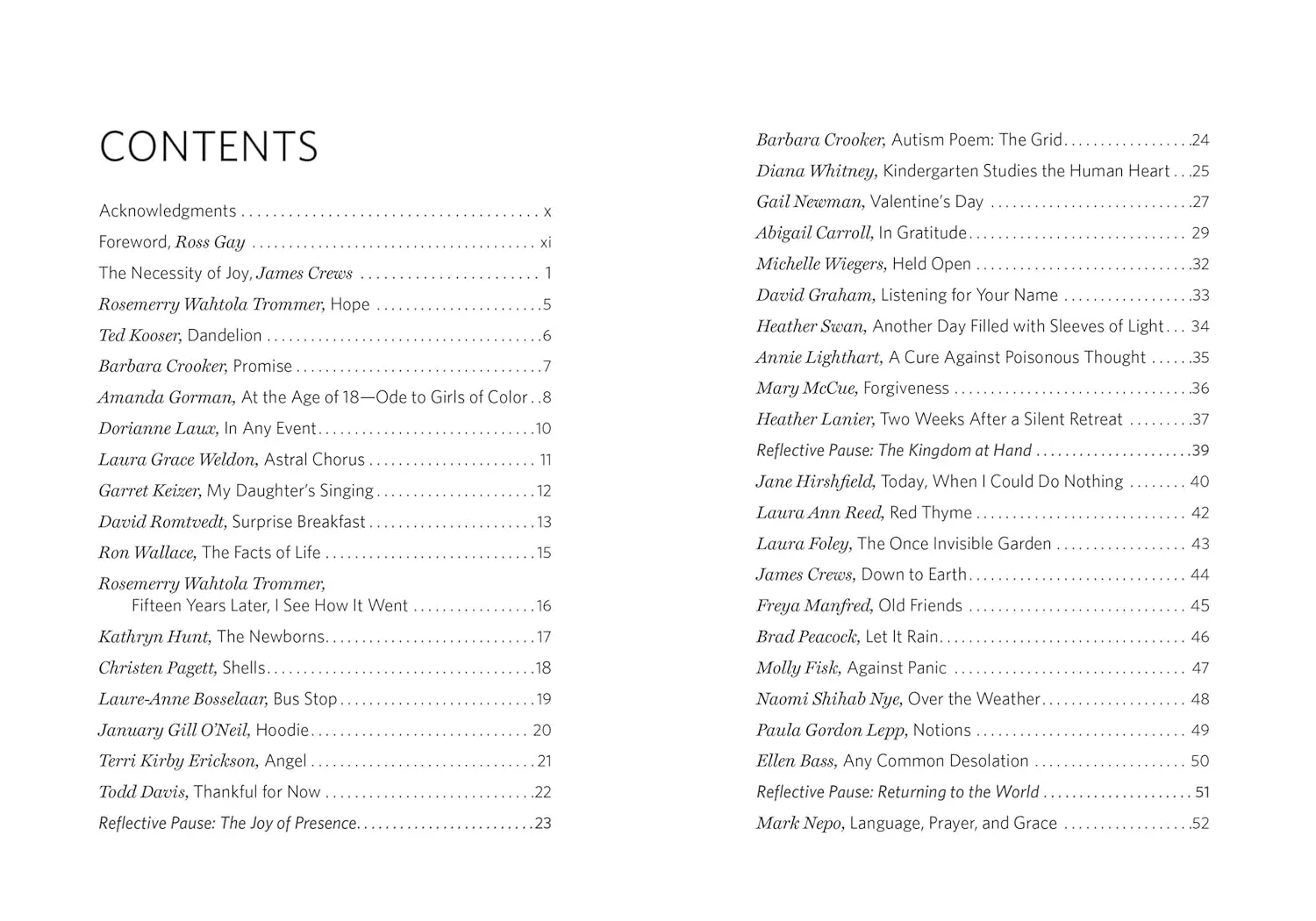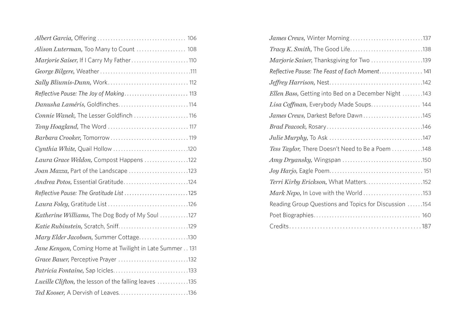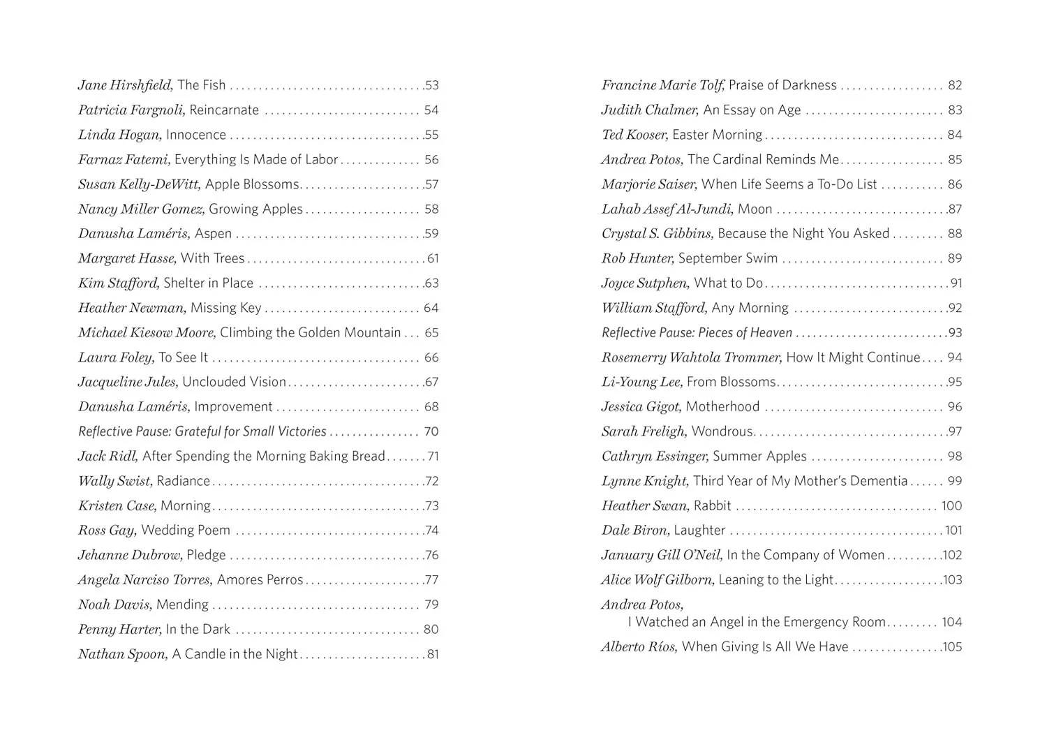 У збірці також представлені нові твори Теда Кузера, Маркa Непо та Джейн Хіршфілд.