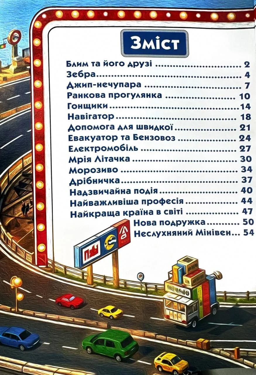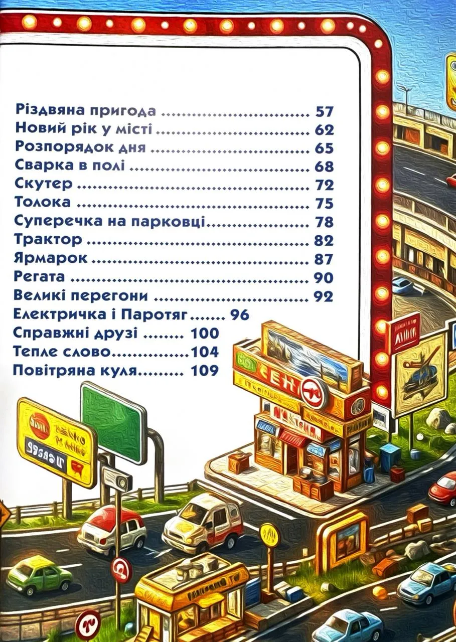 До збірки входять короткі казки про пригоди різних транспортних засобів — кумедних, добрих, із власним характером та поведінкою. Вони потрапляють у захопливі ситуації, де вчаться співпрацювати, допомагати одне одному, проявляти турботу та повагу. Ці історії не лише захоплюють, а й сприяють емоційному розвитку дитини.