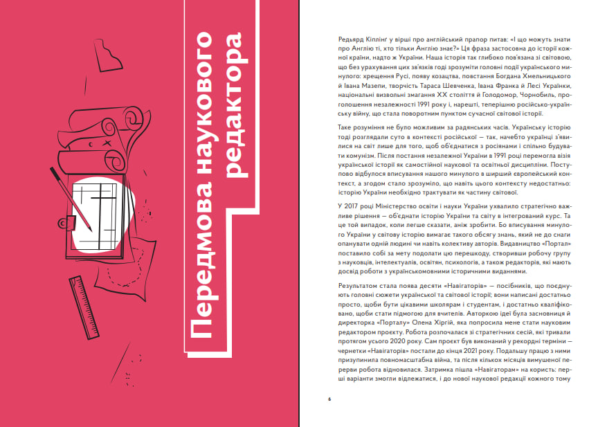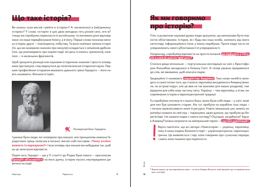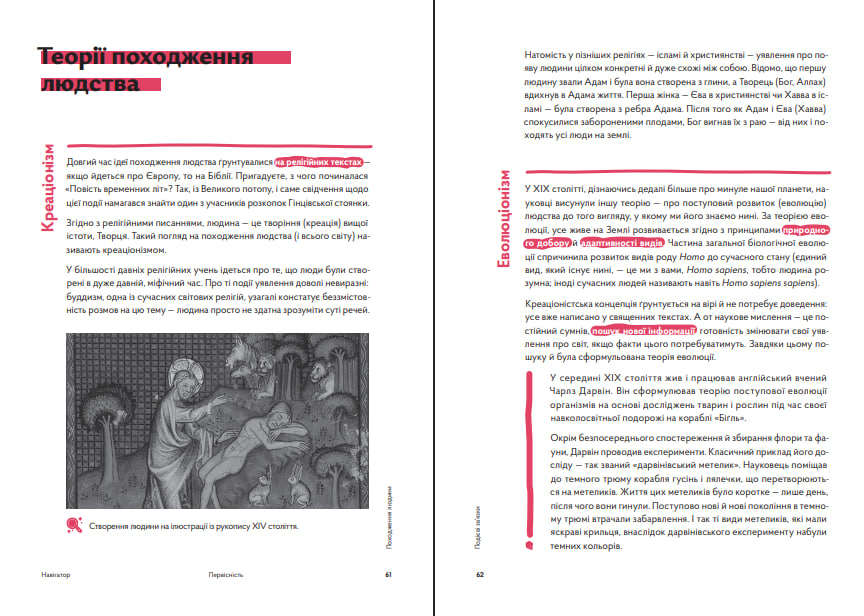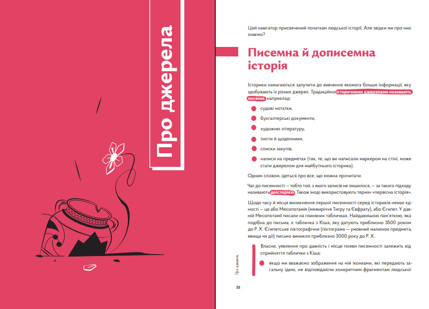 У «Навігаторі», що розповідає про первісність, ідеться про час від появи людини до перших цивілізацій і зародження писемності. На теренах України цей період тривав від 1 мільйона років тому — саме так датовані найдавніші залишки людської життєдіяльності, знайдені на стоянці Королеве на Закарпатті, — до початку І тисячоліття до Р. Х. Книжка знайомить читачів із першими людьми, сценаріями їхніх життів, їхніми способами адаптації до різних навколишніх умов, а також доступно розповідає про методи, завдяки яким ми можемо досліджувати історію дописемного часу.