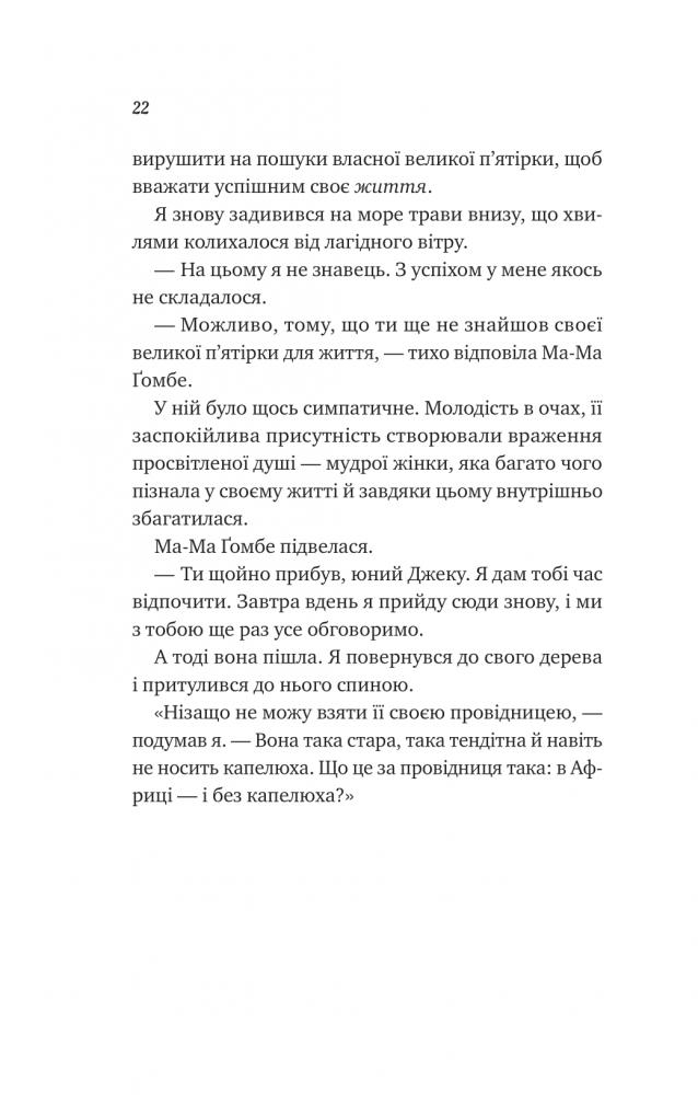 Джек має мрію — побачити Африку й велику п’ятірку її тварин. Ма-Ма Ґомбе за довге життя здійснила не одну свою мрію, але не найзаповітнішу: знайти дорогу до колиски світу, про яку їй розповідав батько. Одного дня їхні шляхи перетнуться, і Ма-Ма Ґомбе допоможе Джекові відкрити для себе Африку. Однак у цій подорожі він віднайде значно більше — свою велику п’ятірку для життя, зустріне справжнього друга й наставника, який на багато років стане для нього провідною зорею, і впустить у себе Африку — неповторний і загадковий світ, який змінить Джека назавжди. А ще він стане тим, хто допоможе Ма-Ма Ґомбе здійснити її найзаповітнішу мрію.
