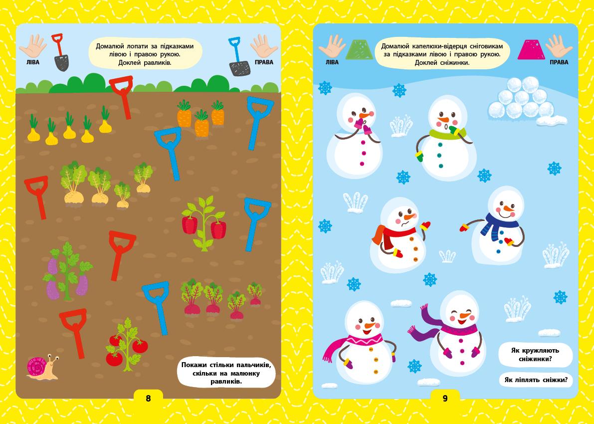 ''Ця книжка допоможе дитині навчитися малювати обома руками прості предмети. Цікаві малюнки спонукатимуть малюка завершити роботу художника: домалювати вогники, вушка тварин, ніжки грибів, листочки та пелюстки квітів, сніжок тощо. Кольорові підказки допоможуть зрозуміти, що потрібно малювати правою рукою, а що — лівою. Наліпки урізноманітнять роботу з виданням, а додаткові питання допоможуть розвинути мовлення, потренувати пам'ять та увагу.Видання призначене для спільної роботи дітей раннього дошкільного віку з батьками чи вихователями.''