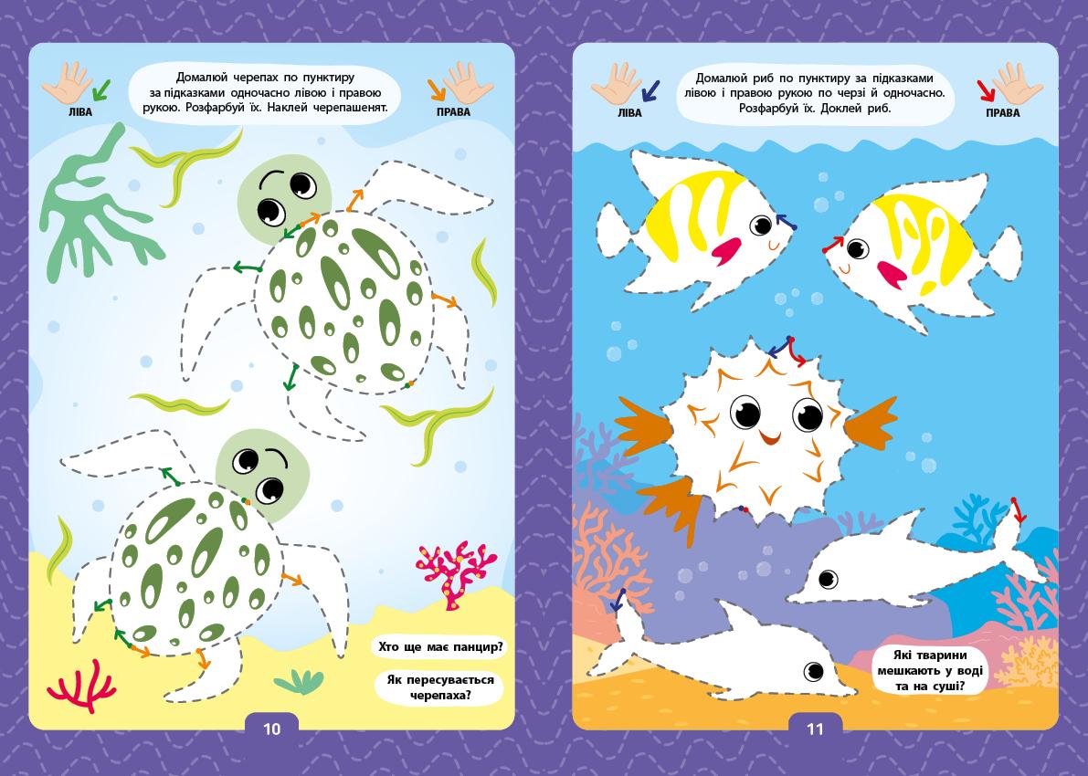 ''Ця книжка допоможе дитині навчитися наводити по пунктиру одночасно обома руками прості малюнки: кульки, квіти, метелики, печиво, будинки, тварин і птахів тощо. Кольорові стрілочки підкажуть, що потрібно наводити правою рукою, а що — лівою. Наліпки урізноманітнять роботу з виданням, а додаткові питання допоможуть розвинути мовлення, потренувати пам'ять та увагу.Видання призначене для спільної роботи дітей раннього дошкільного віку з батьками чи вихователями.''