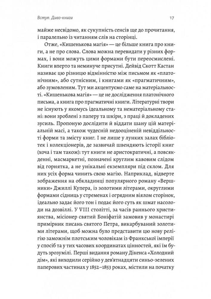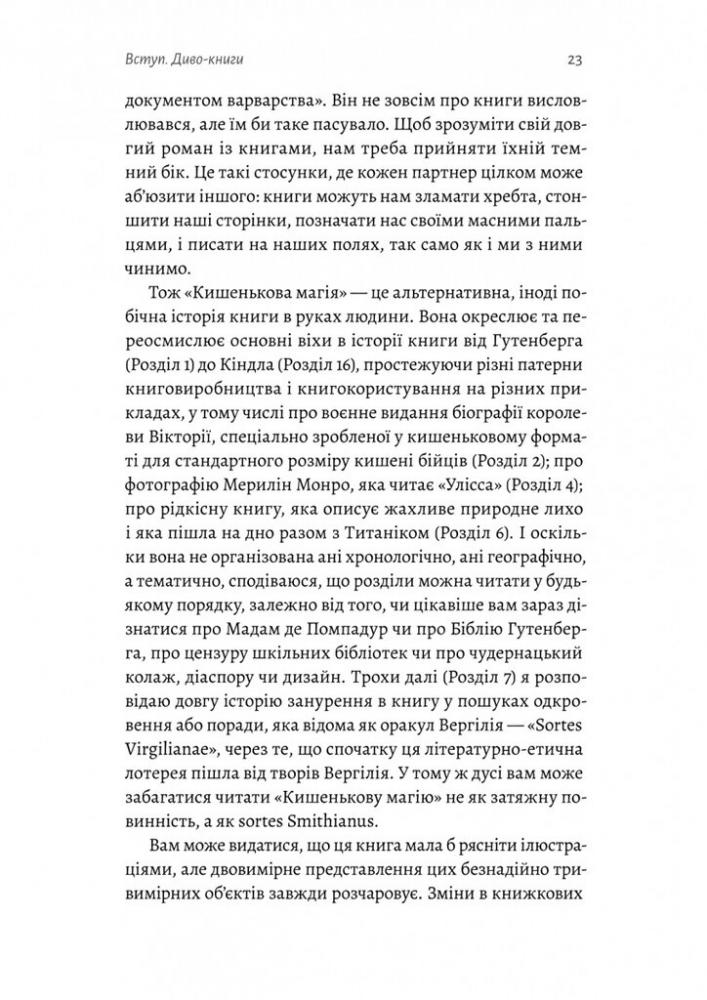 Історія книжки — однієї з найстійкіших та найвпливовіших технологій людства за останнє тисячоліття. Стівен Кінг якось сказав, що книжки — це «унікальна кишенькова магія», і не помилився. Від спростування міфу про те, що верстат Гутенберга був першим друкарським обладнанням, до декоративних подарункових видань, що надихнули жінок брати участь у боротьбі за свободу від рабства. Від книжок у м'якій обкладинці, які стали зброєю під час Другої світової війни, до книжки в пластиковій упаковці, повністю зробленої зі шматочків американського сиру. Викладачка Оксфордського університету Емма Сміт запрошує читачів у літературну пригоду крізь час і простір, де досліджує як, коли й чому людство стало одержиме книжками. Авторка приділяє особливу увагу тому, що називається «книжковістю» — запахам, сторінкам, полям для записів, ілюстраціям на обкладинці тощо. Упродовж століть книжки мали визначальний вплив на всю історію людства і, можливо, саме тому, попри десятиліття передчасних прижиттєвих некрологів й альтернативи читанню, вони все одно живі. Чому варто прочитати книжку «Кишенькова магія»? Виклик усім поціновувачам літератури, який демонструє творчу силу та вічну красу друкованого слова. Глибоке історичне дослідження складного мистецького об'єкта, який впродовж багато століть рішуче й непередбачувано розширював стосунки між читачами, країнами, ідеологіями й культурами. Кардинально нова історія книжки та ролі, яку вона впродовж століть відігравала в житті людини.