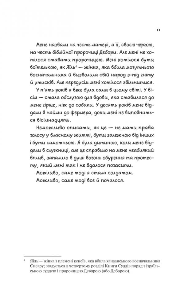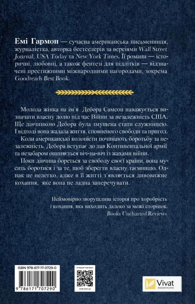 Дебора — здібна дівчинка. Ба більше: багато в чому вона виявилася вправнішою за своїх названих братів. Однак таке життя не для неї: юна й відважна героїня прагне свободи та пригод. Щойно почалася Війна за незалежність США, двадцятирічна Дебора зважується на відчайдушно сміливий крок: вступає до війська, вдаючи із себе хлопця. Та як зберегти власну таємницю, коли закоханість накриває з головою?