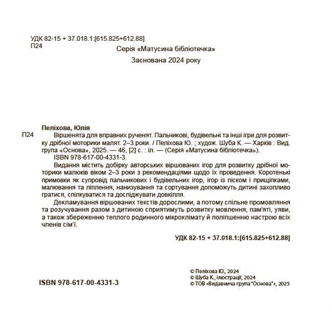 «Віршенята для вправних рученят» — це чудово ілюстрована добірка авторських віршованих ігор для розвитку дрібної моторики малюків віком 2–3 роки з рекомендаціями щодо їх проведення. Коротенькі примовки як супровід пальчикових і будівельних ігор, ігор із піском і прищіпками, малювання та ліплення, нанизування та сортування допоможуть дитині захопливо гратися, спілкуватися та досліджувати довкілля. «Віршенята для вправних рученят» — це незабутні миті теплого спілкування батьків із малюками. Нехай цих моментів буде якнайбільше!