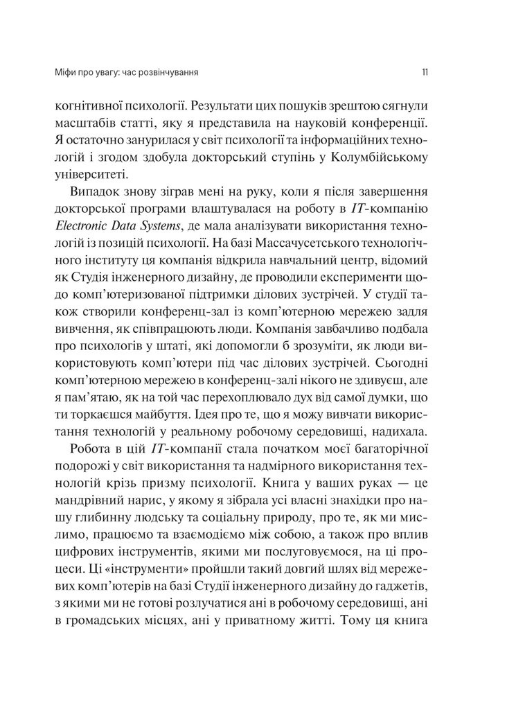 Авторка — докторка філософії, професорка інформатики Каліфорнійського університету — досліджує, як цифрова епоха трансформує нашу поведінку, викликає фрагментацію уваги та формує звички постійного самопереривання. Згідно з її дослідженнями, людина перемикає увагу щодня у 20 сферах діяльності, а кожні 10,5 хвилин втрачає зосередженість. Відновлення концентрації на перерваному завданні займає приблизно 25 хвилин.