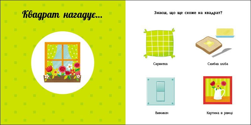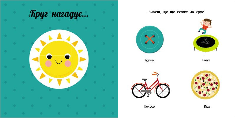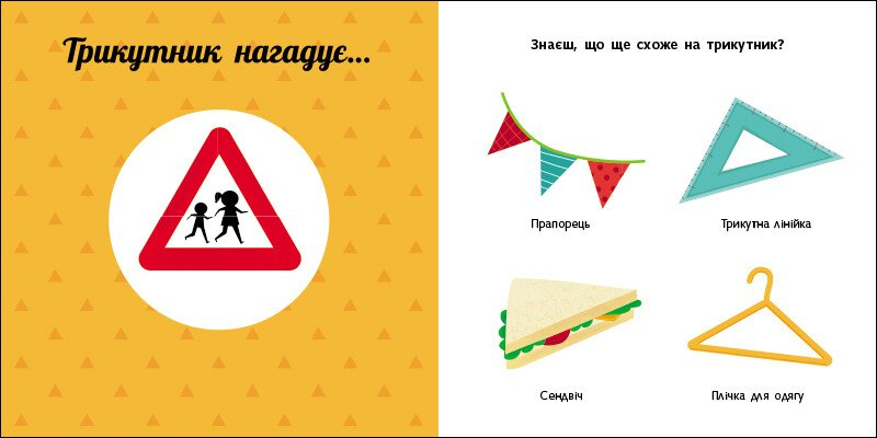 На сусідній сторінці після вивчення фігури дитина може закріпити знання — розглянути яскраві ілюстрації з предметами відповідної форми та впізнати їх самостійно. Це робить процес навчання цілісним і ефективним.