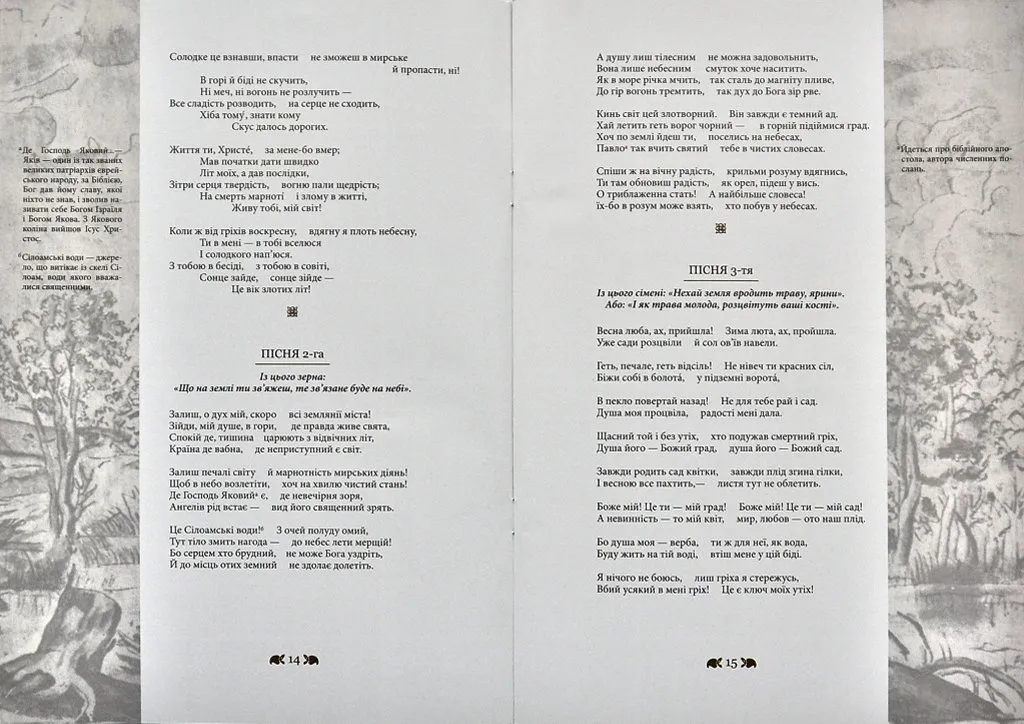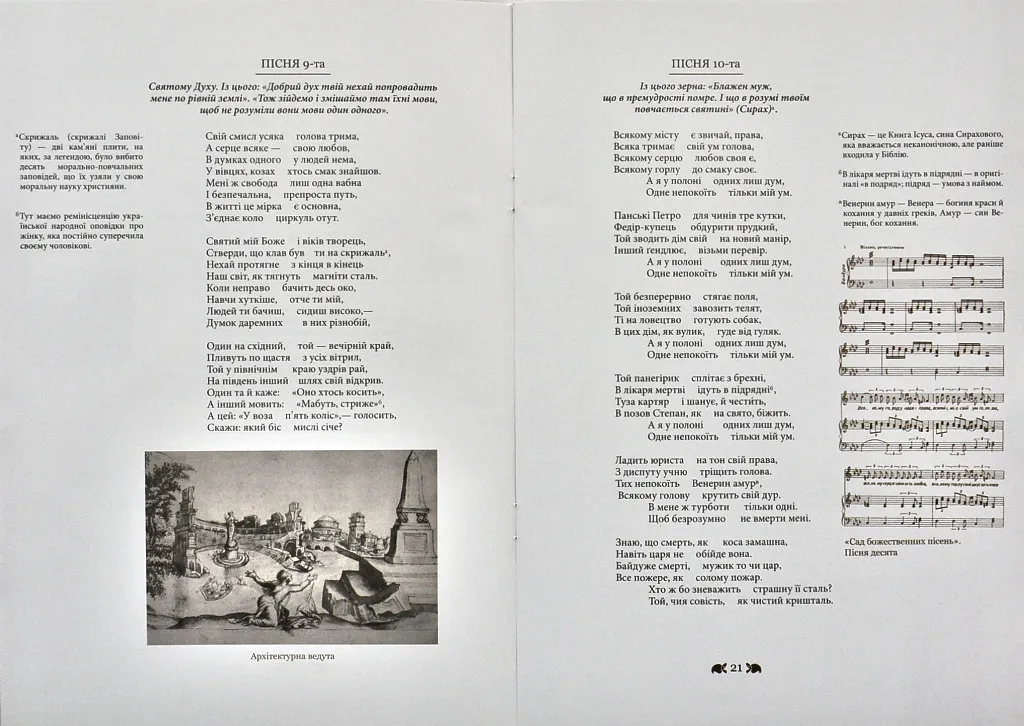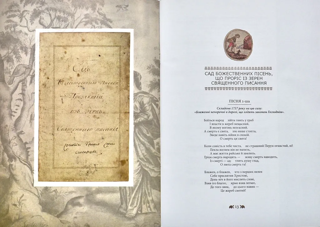 В цьому виданні подано вибір найпопулярніших творів українського поета і мислителя XVIII століття. З огляду на використання цих текстів в старших класах середніх шкіл і для тих школярів і вчителв, які зацікавляться творами Сковороди, всі тексти подаємо в перекладі на сучасну літературну мову з урахуванням цезур. Цезура — це пробіл посередині рядка у силабічному вірші. Він (пробіл) був для того, щоб при читанні робилася пауза. Система ілюстрацій відбиває образотворче бачення світу XVIII століття.