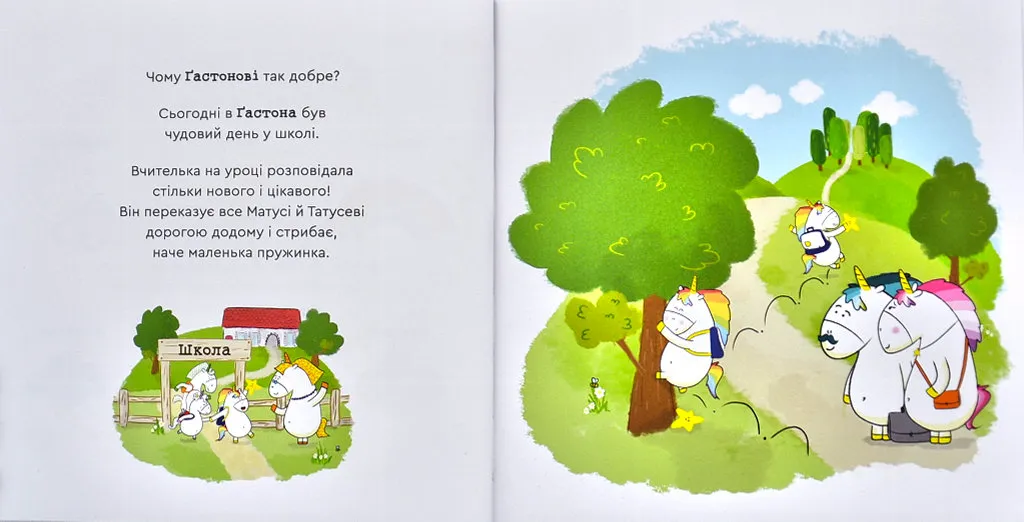 Ґастон — це малий єдиноріг. Він такий, як і всі інші, або майже такий… Його веселкова грива змінює барви залежно від того, яку емоцію він відчуває! Сьогодні Ґастон почувається пречудесно! Він повсюди стрибає і шаленіє. За всяку ціну єдиноріг намагається привернути до себе увагу. Поглянь, як він навчиться використовувати всю свою енергію. Ці історії навчать висловлювати свої емоції і керувати ними.