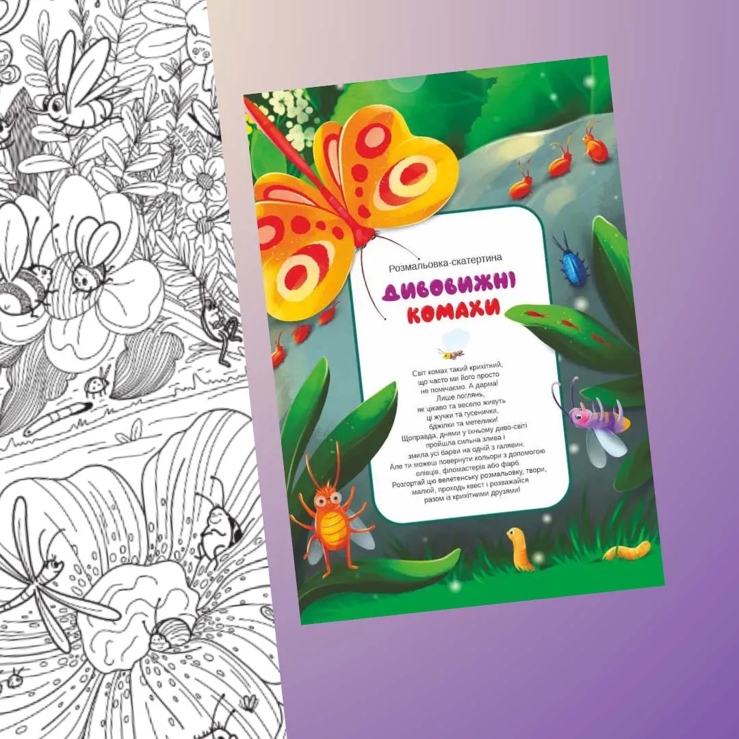 Світ комах такий крихітний, що часто ми його просто не помічаємо. А дарма! Лише поглянь, як цікаво та весело живуть ці жучки та гусенички, бджілки та метелики! Щоправда, днями у їхньому диво-світі пройшла сильна злива і змила усі барви на одній з галявин. Але ти можеш повернути кольори з допомогою олівців, фломастерів або фарб.