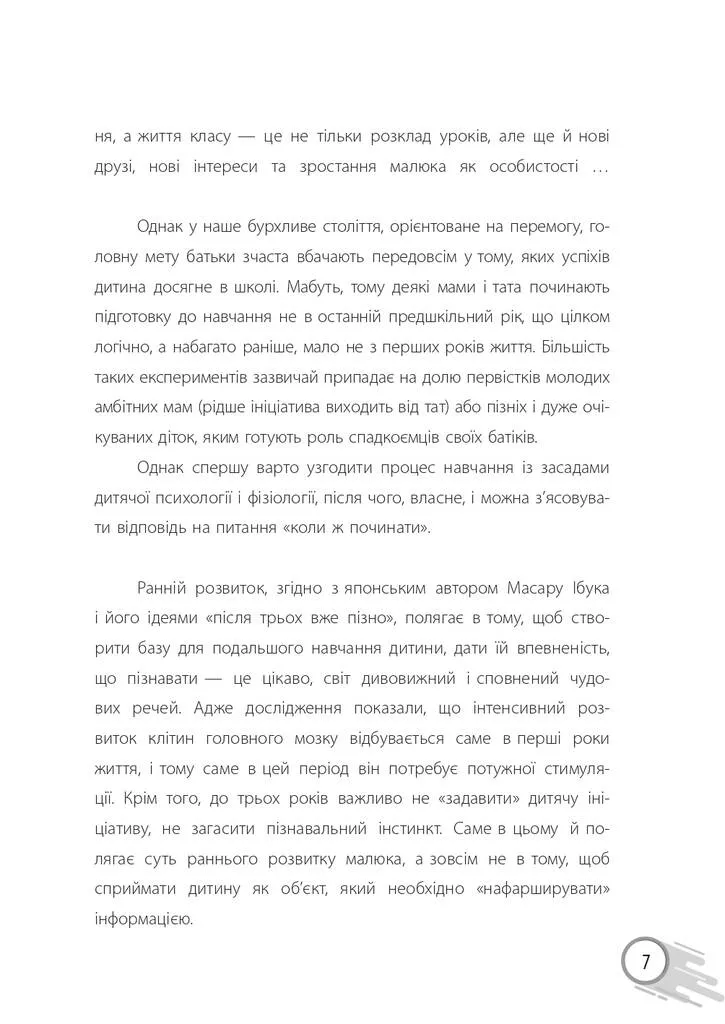 1. Збираємось до школи! У цьому розділі батьки знайдуть рекомендації: як обрати школу та вчителя; як зрозуміти, чи готова дитина до навчання в школі; віддавати дитину до школи в 6 чи 7 років? + Добірку цікавих ігор та експериментів, для вироблення необхідних умінь і навичок у дитини.