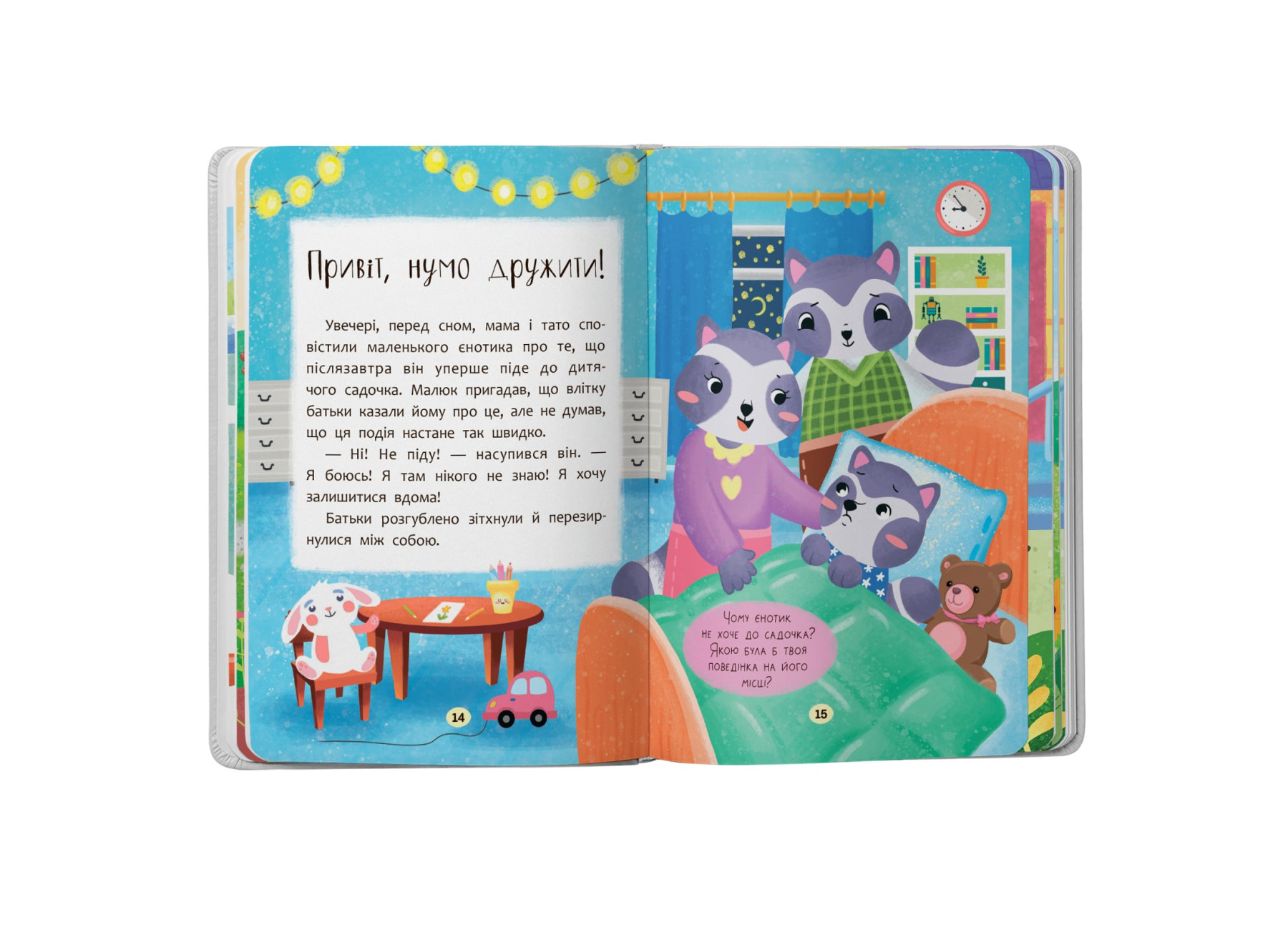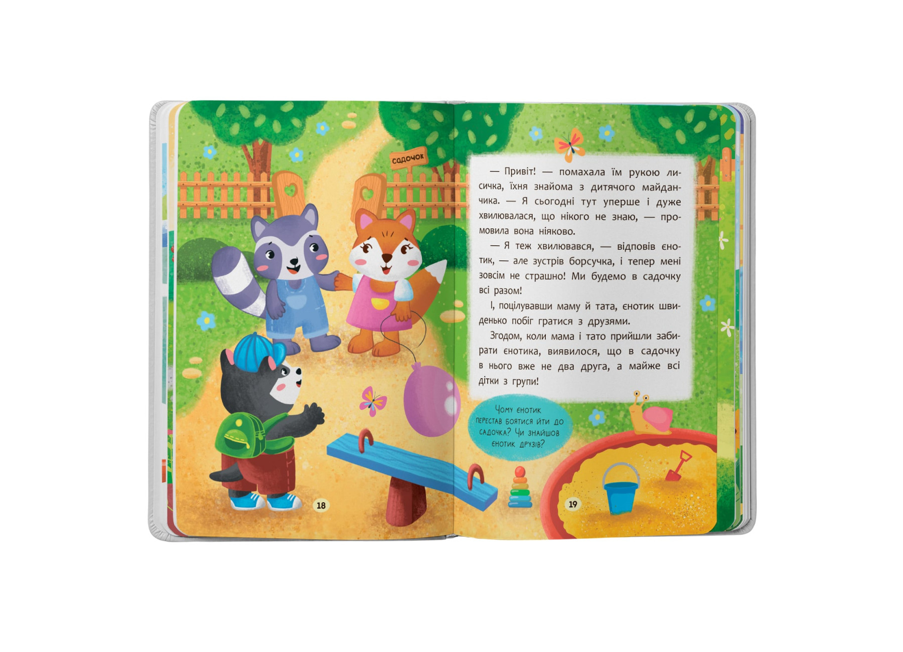 Ваше маля скоро піде до дитячого садочка? Потрапляючи в незнайому обстановку, дитина зазвичай відчуває сильний стрес. Тож завдання дорослих — зробити відвідування дитячого садка приємним та комфортним. Це видання стане незамінним помічником у вихованні малюка, а милі герої на своєму прикладі покажуть, що в дитячому садку зовсім не страшно, а весело та цікаво. Книга допоможе дитині налагодити спілкування з однолітками та швидко й екологічно адаптуватися до дитячого садка.Книжку адресовано дітям дошкільного віку і їхнім турботливим батькам.