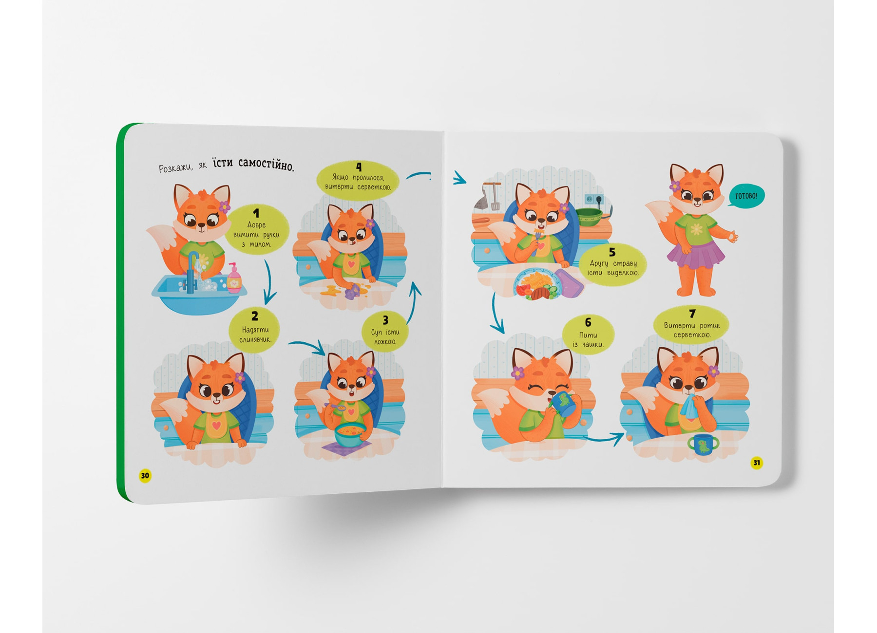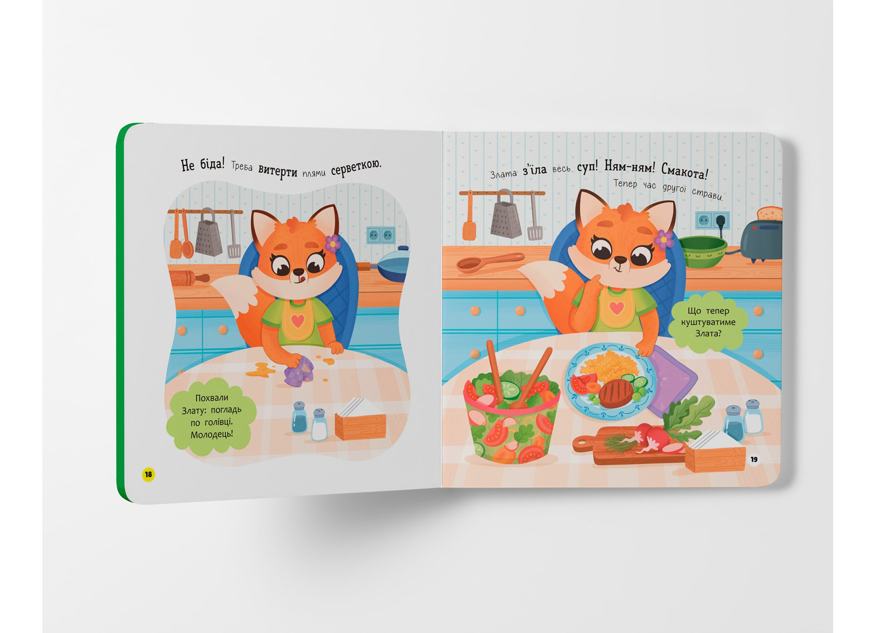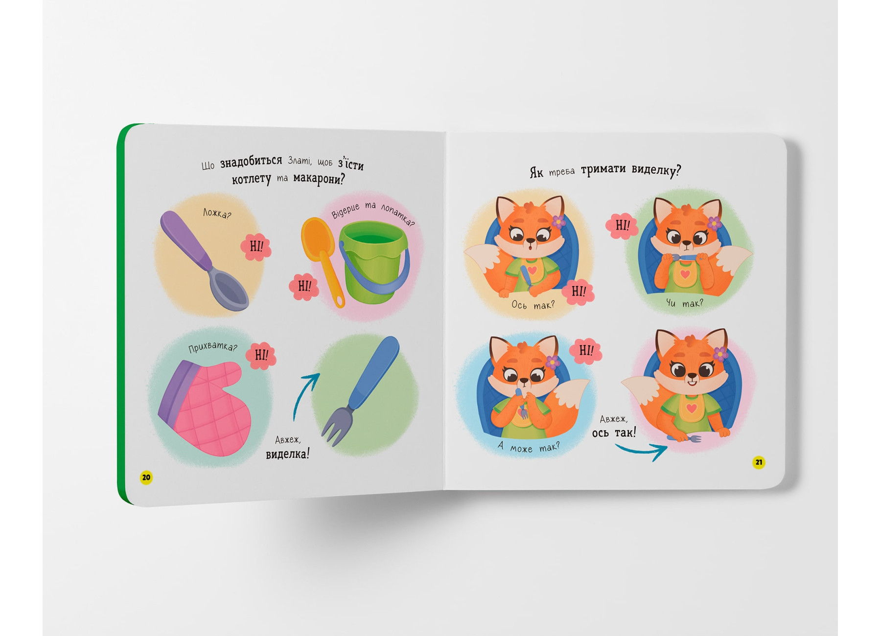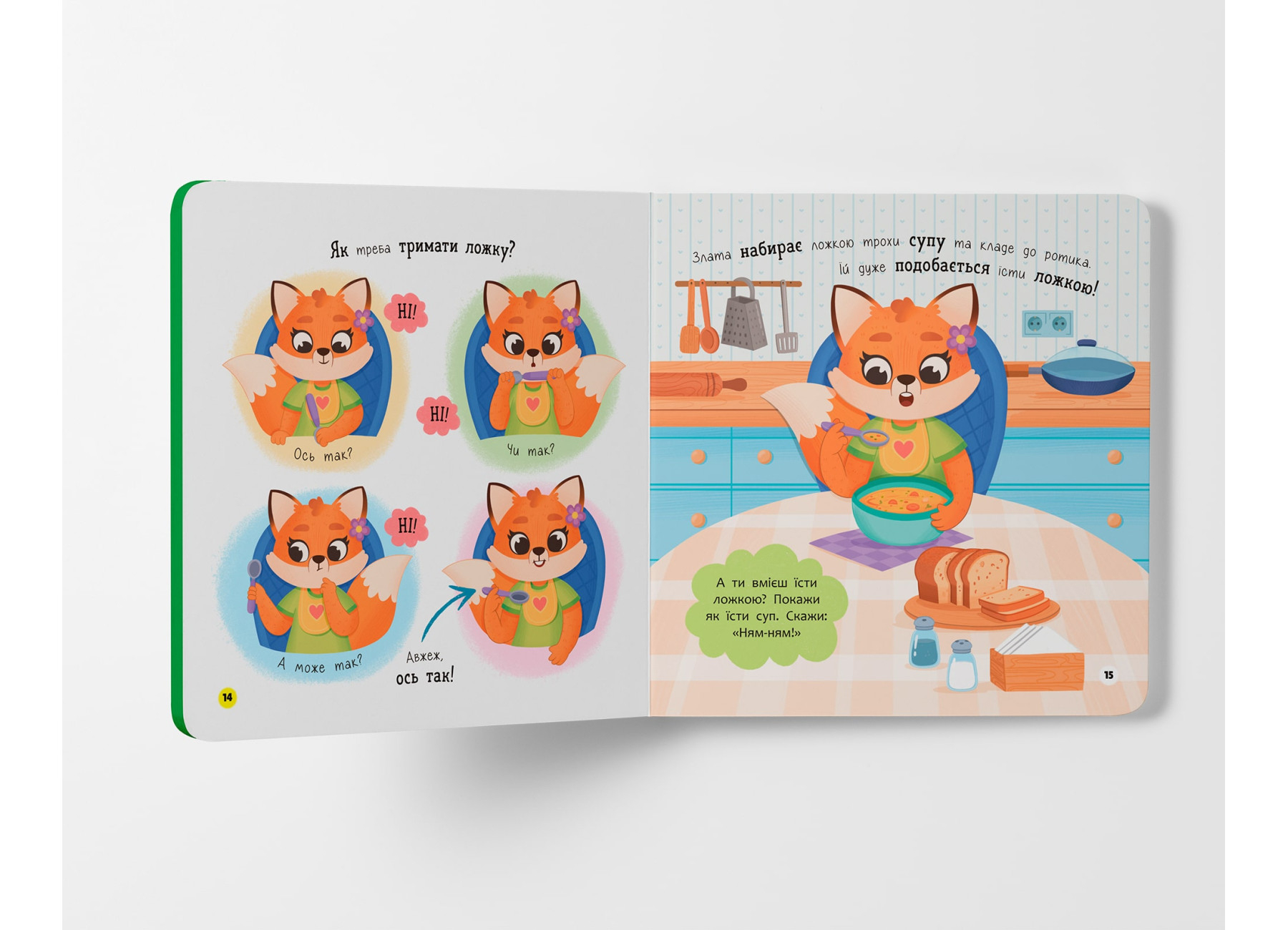 Ця інтерактивна книжка підкаже батькам, як в ігровій формі допомогти дитині легко опанувати використання ложки, виделки та чашки, швидко звикнути їсти самостійно, запам’ятати важливі правила гігієни та охайної поведінки за столом. Разом з милим героєм ваш малюк засвоюватиме важливі навички: запам’ятає правильну послідовність дій — вимити ручки з милом, сісти на дитячий стілець, надягти слинявчик, правильно взяти ложку. А якщо раптом не вийшло з першого разу — не треба засмучуватися, варто спробувати ще.