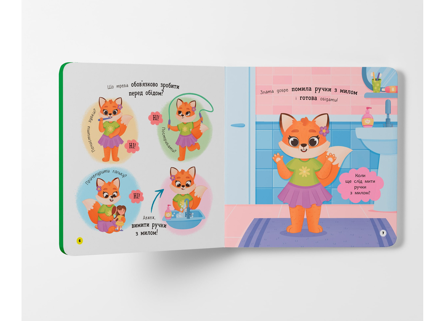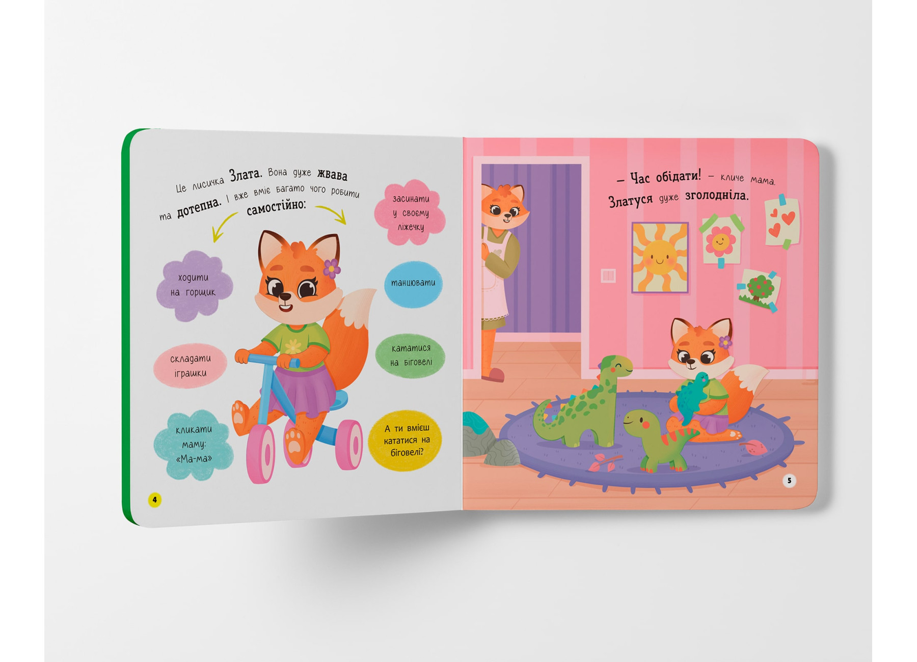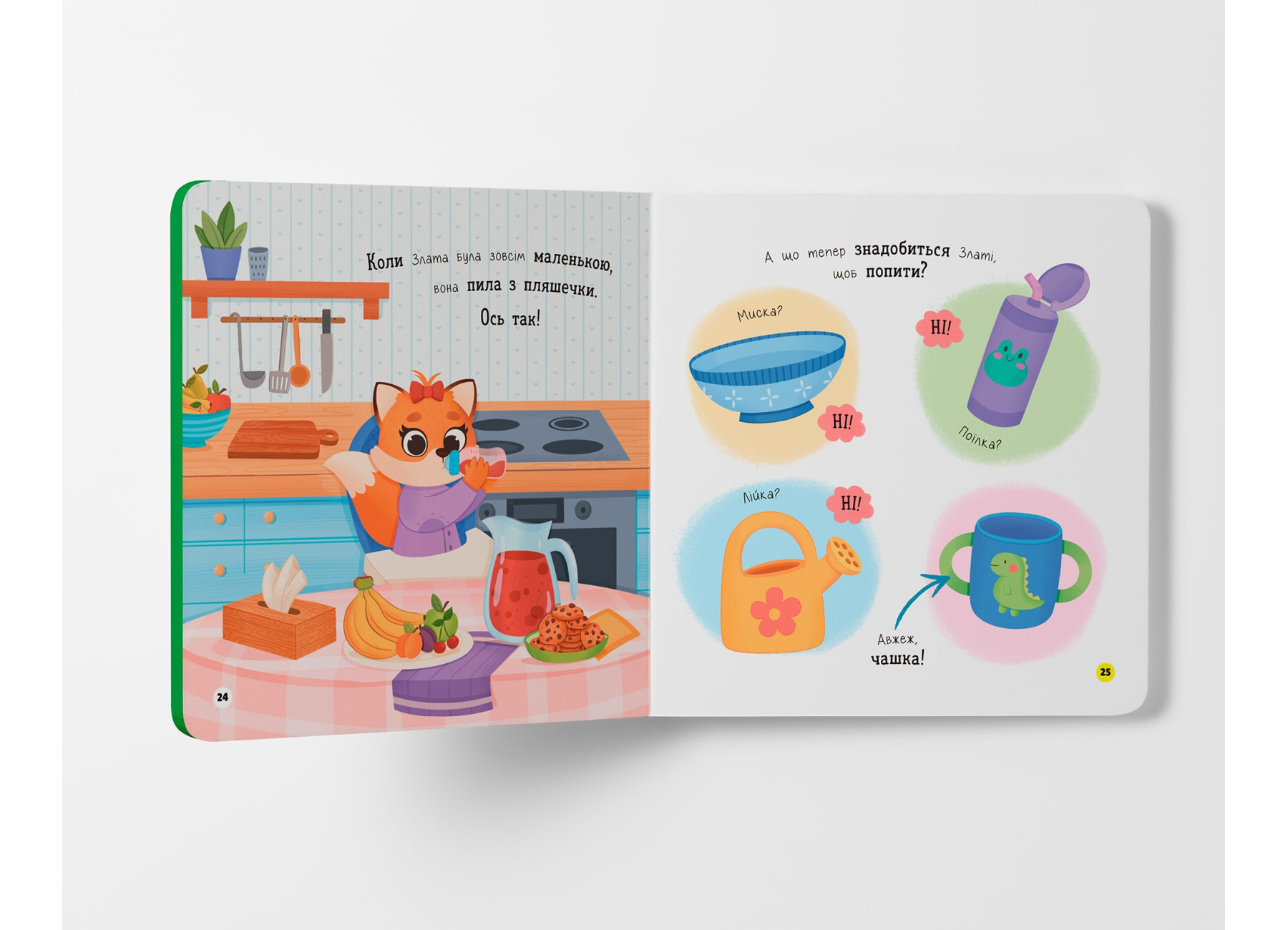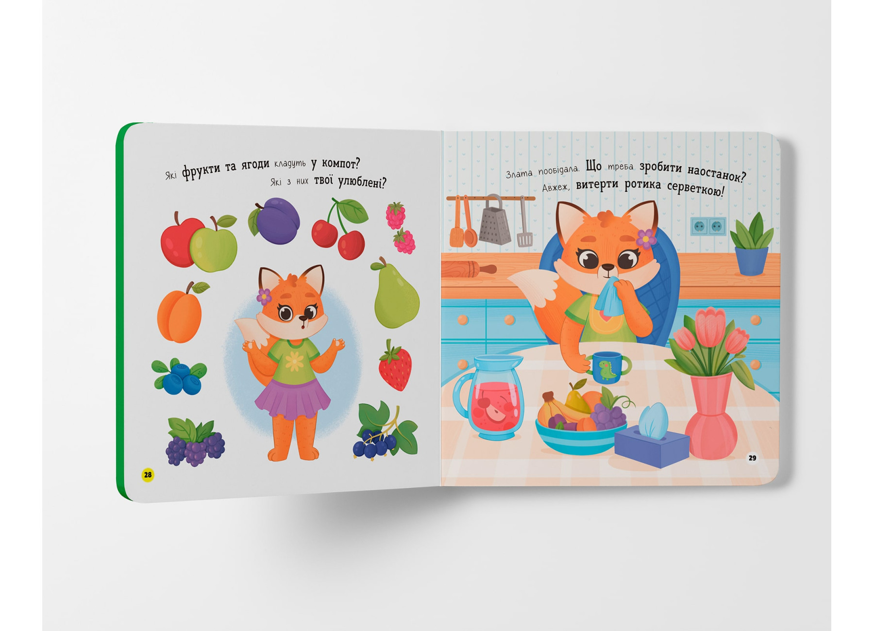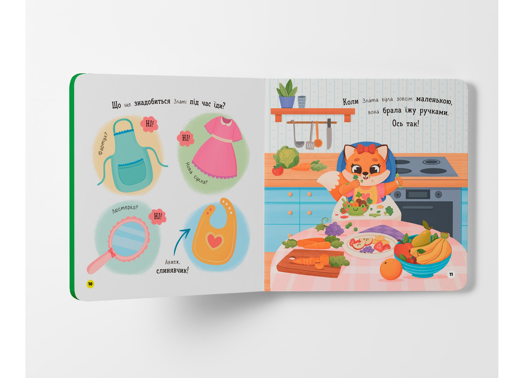 Ця інтерактивна книжка підкаже батькам, як в ігровій формі допомогти дитині легко опанувати використання ложки, виделки та чашки, швидко звикнути їсти самостійно, запам’ятати важливі правила гігієни та охайної поведінки за столом. Разом з милим героєм ваш малюк засвоюватиме важливі навички: запам’ятає правильну послідовність дій — вимити ручки з милом, сісти на дитячий стілець, надягти слинявчик, правильно взяти ложку. А якщо раптом не вийшло з першого разу — не треба засмучуватися, варто спробувати ще.