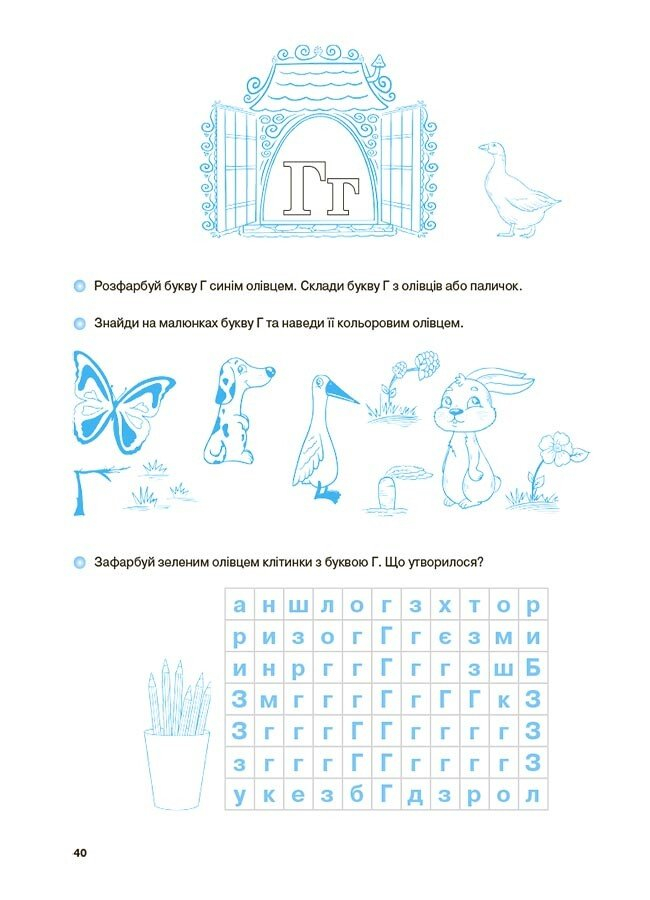 - зі зʼєднанням відповідних букв; з розфарбовками;