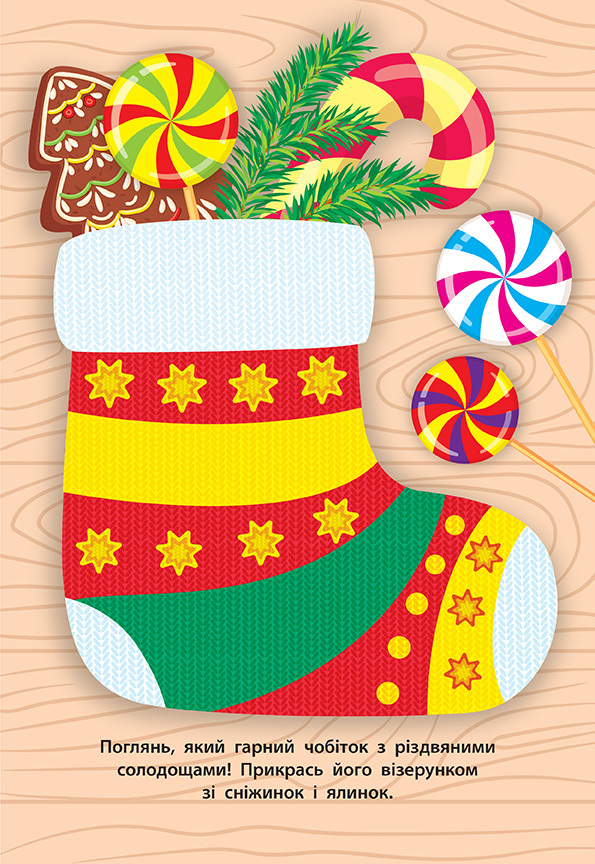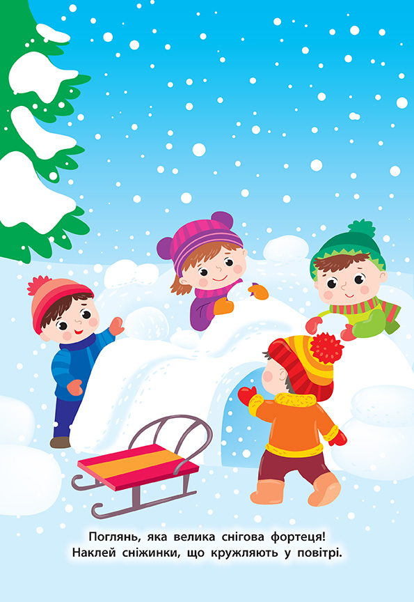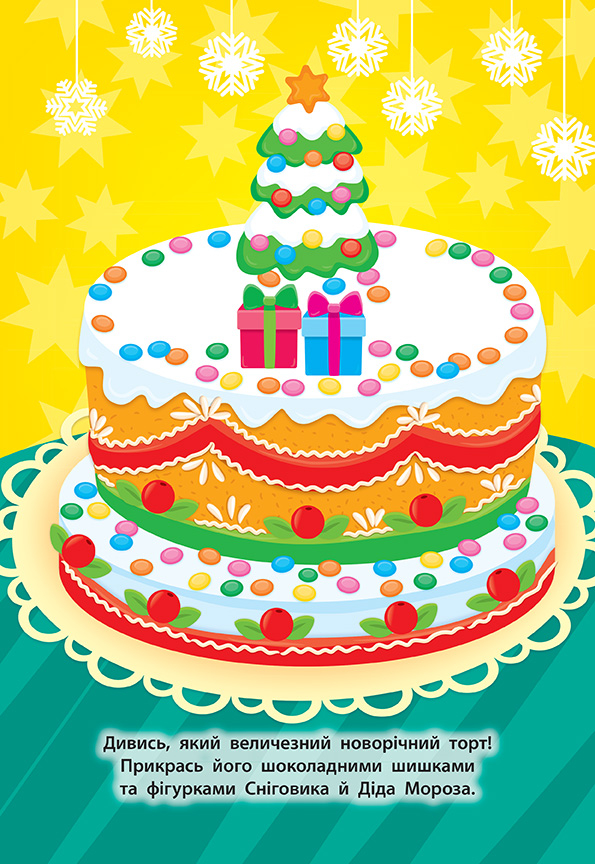 - Ялинка: У цій книжці малюк зможе прикрасити ялинку за допомогою наліпок, виконуючи прості завдання, що сприяють розвитку фантазії та мислення.