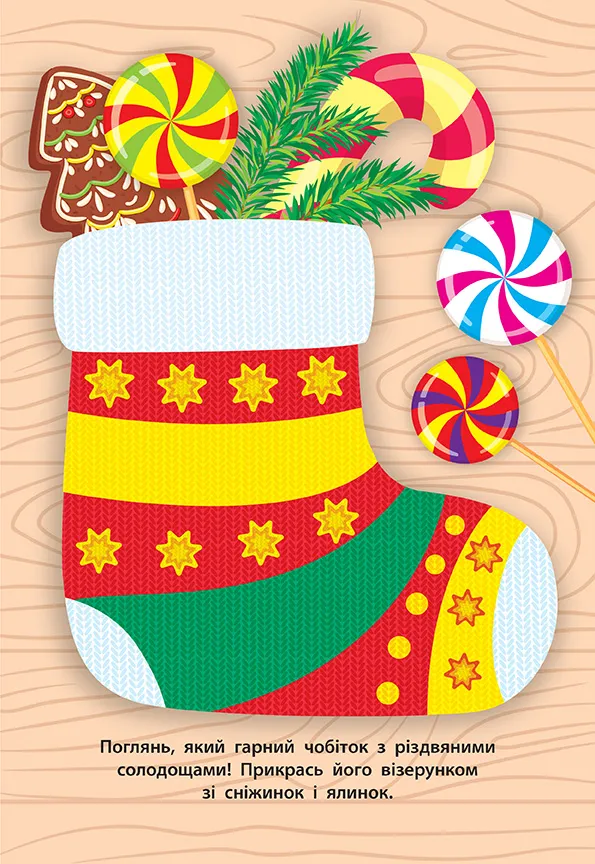 - Чобіток з подарунками: Книжка пропонує ще більше веселих завдань, де діти можуть розвивати свої навички, граючи з наліпками.