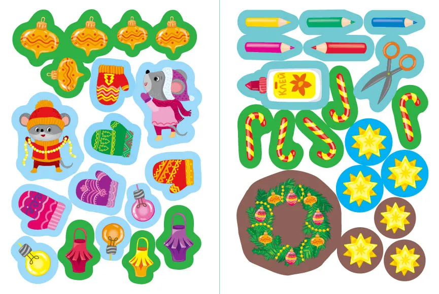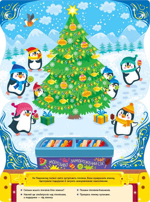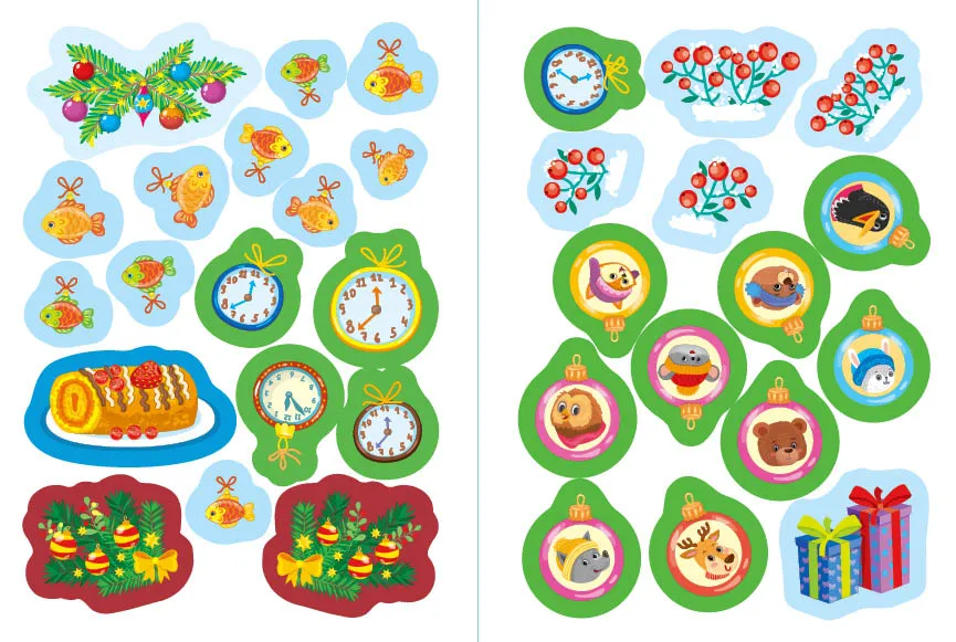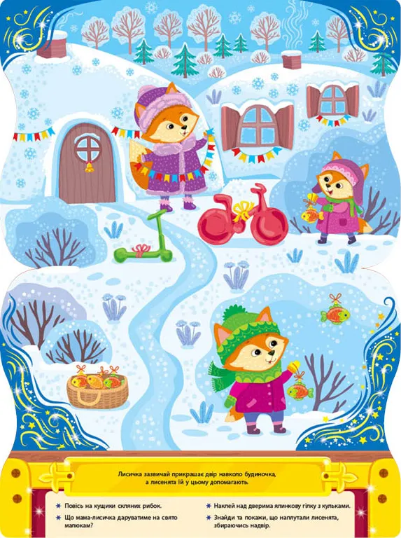 - Ялинкові прикраси: Книжка-скринька запрошує дітей поринути у чарівний світ святкового декору, де вони зможуть створювати власні ялинкові прикраси за допомогою наліпок. Завдяки захопливим завданням, малюк розвине свою фантазію, мовлення та дрібну моторику пальців. Це видання чудово підходить для спільної діяльності з дорослими, допомагаючи зміцнити зв'язок між батьками та дітьми.
