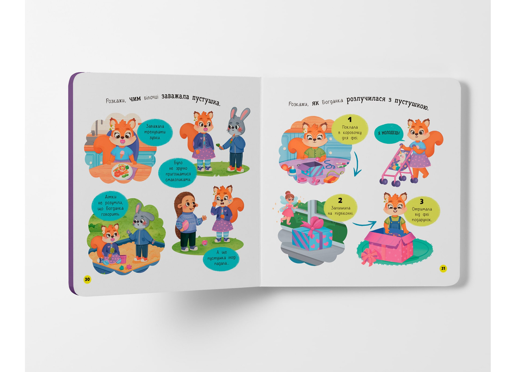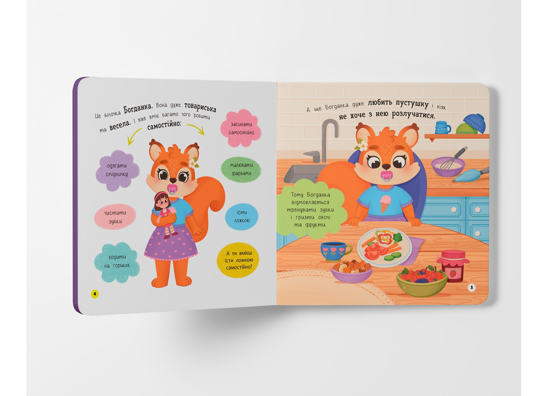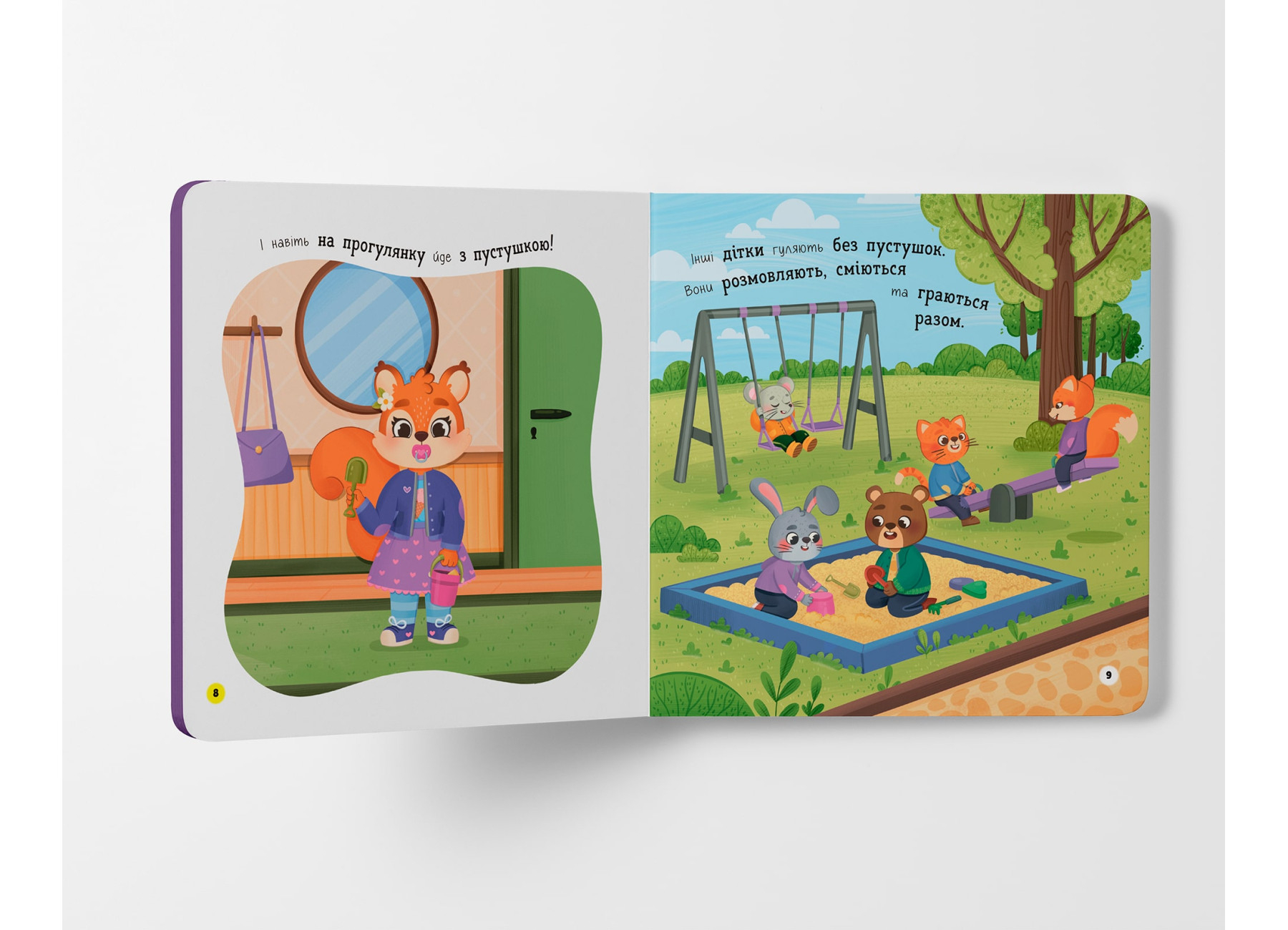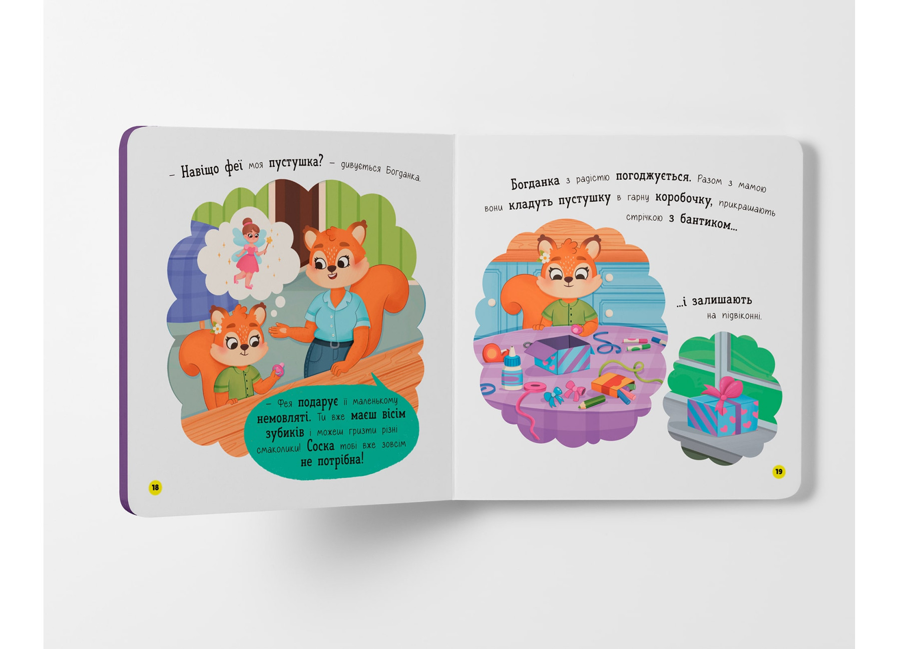 Інтерактивна книжка стане незамінним помічником для батьків, які прагнуть легко й без стресу допомогти дитині попрощатися з пустушкою. Завдяки веселій історії про білочку Богданку, малюк у дружній ігровій формі усвідомить, що без пустушки світ стає яскравішим і цікавішим.