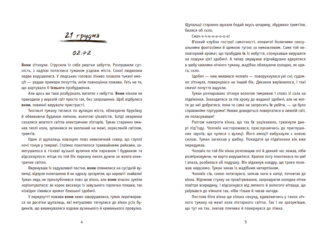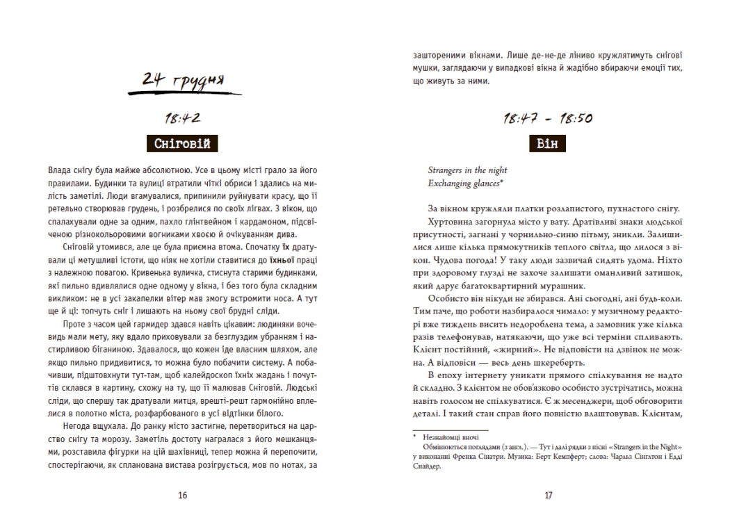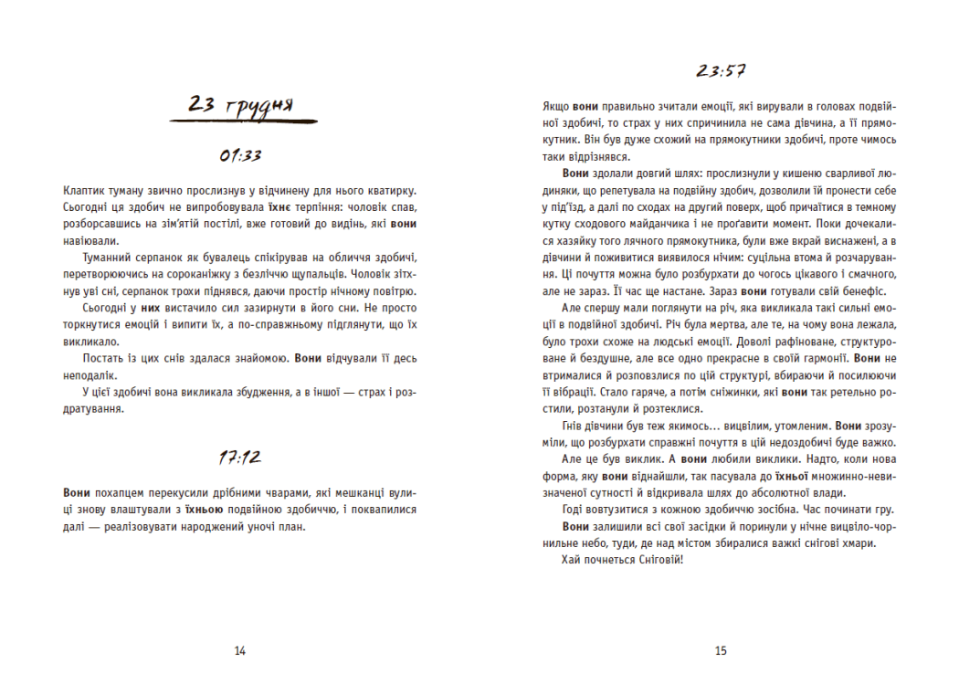 Вечір. Тиха вуличка засніженого міста — і двоє самотніх, чиї вікна навпроти. Незнайомці вночі обмінюються поглядами… Скидається на початок пісні або романтичної історії, чи не так? Проте є ще дещо в цій історії. Могутнє й невідоме, що мешкає в сніговій заметілі. Ця таємна сила має план.Таємнича заметіль закручує події, заплутує усе, перетворюючи звичне й знайоме на химерне й жаське. Кіберзлочинці, повідомлення з погрозами, уривки шкідливого коду, шпигунські ігри… поліцейські, слідчий СБУ з псевдо Мольфар… І цей дивний сніговій… Здається, це він смикає людей за невидимі ниточки, змушуючи їх грати у власну гру…...Дівчина безслідно зникає з власної квартири майже на очах сусіда, а зимова ніч збурює протистояння сутностей, про існування яких люди й не здогадуються. Але дехто завжди поруч. Дехто спостерігає...