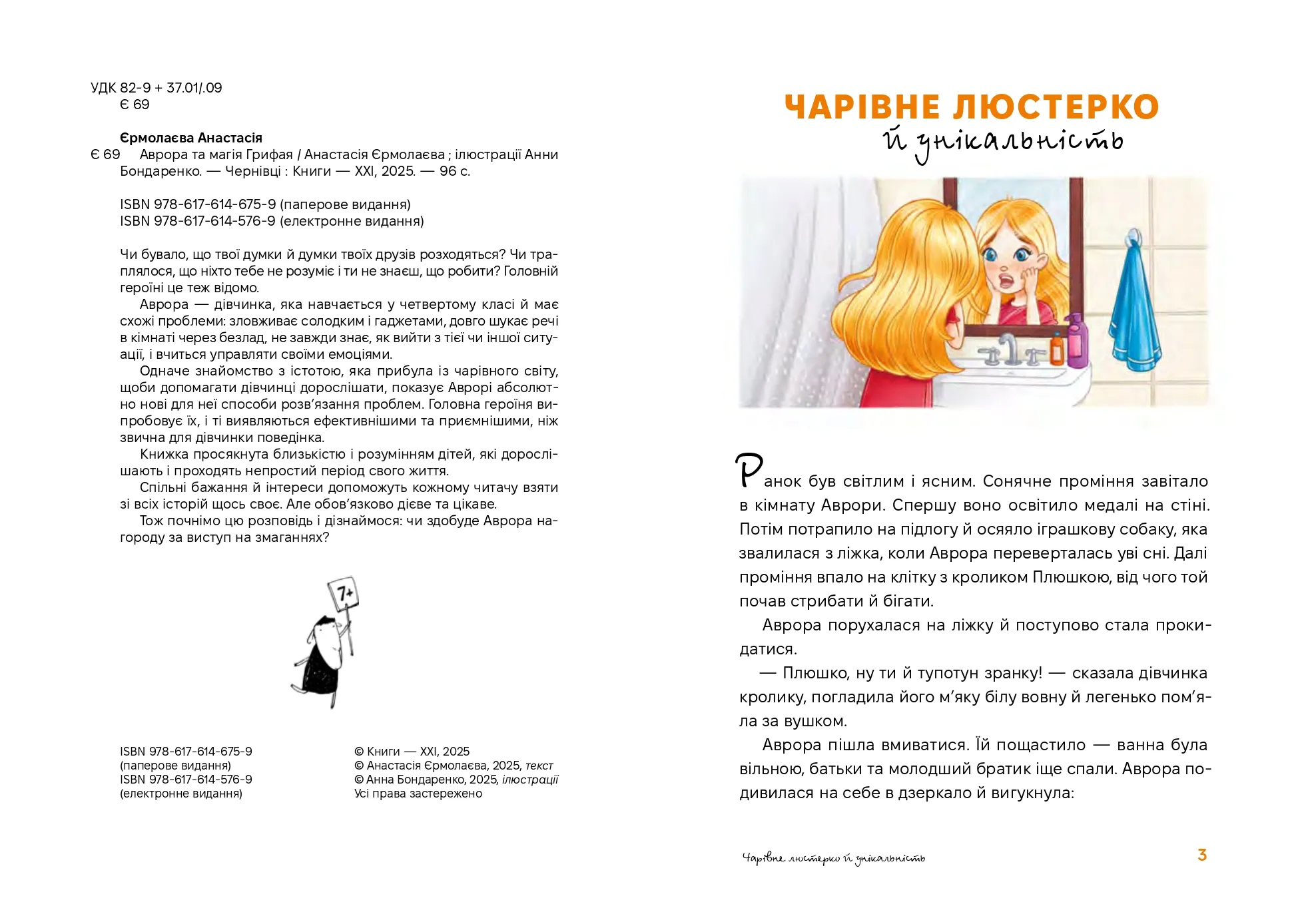 Книга Аврора та магія Грифая — це сучасна повчальна історія для молодших школярів, створена талановитою українською авторкою Анастасією Єрмолаєвою. Цей твір сповнений доброти, реалістичних ситуацій і водночас захопливих казкових пригод, які допомагають дітям вчитися управляти емоціями, приймати рішення та розуміти навколишній світ.