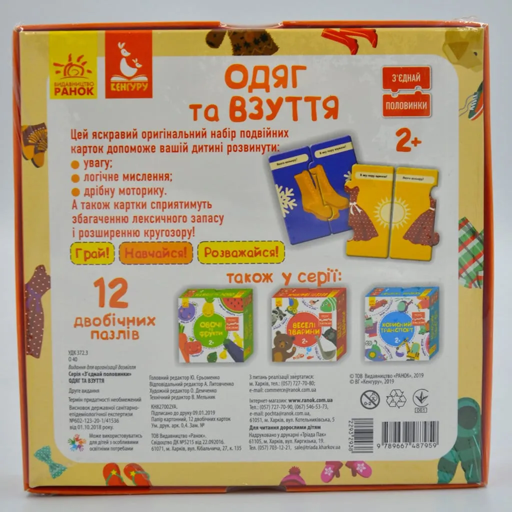 З'єднай половинки. Одяг та взуття. 12 двобічних пазлів. Коробка. 2+
