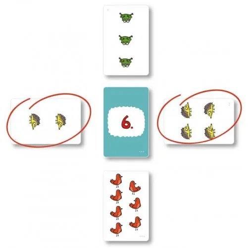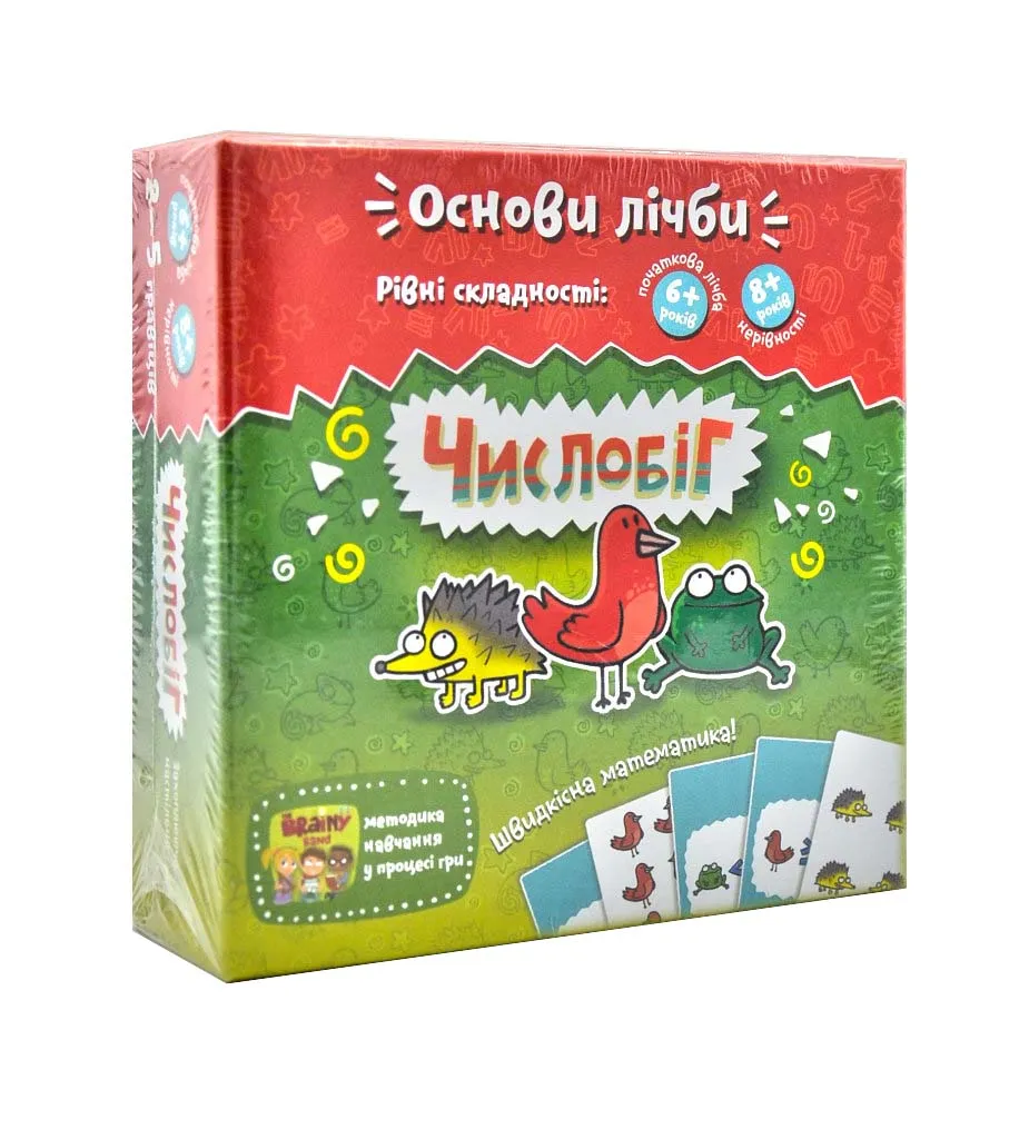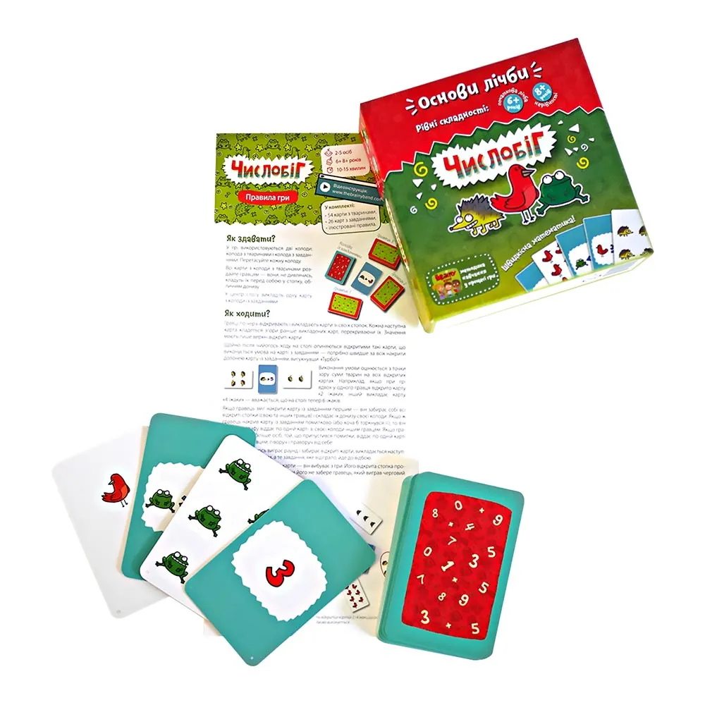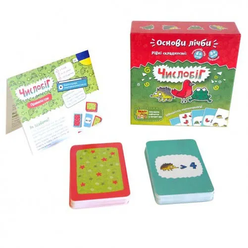Гра на швидкість і увагуНастільна гра «Числобіг» - навчальна гра, в якій діти будуть рахувати наввипередки. Є карти тварин і карти завдань. Карти з тваринами роздають гравцям порівну і кладуться перед ними стопками. На карти дивитися не можна. В процесі партії гравці одночасно відкривають верхні карти тварин в своїх колодах.