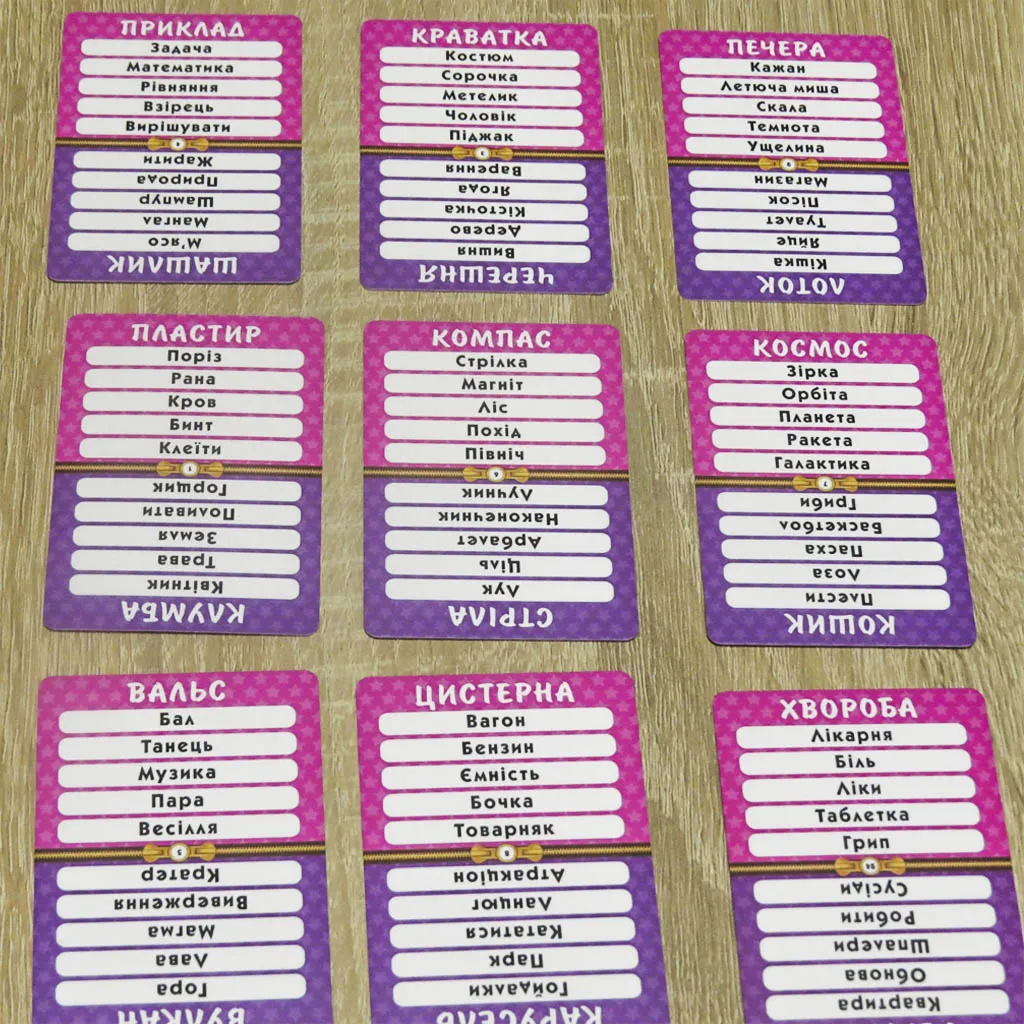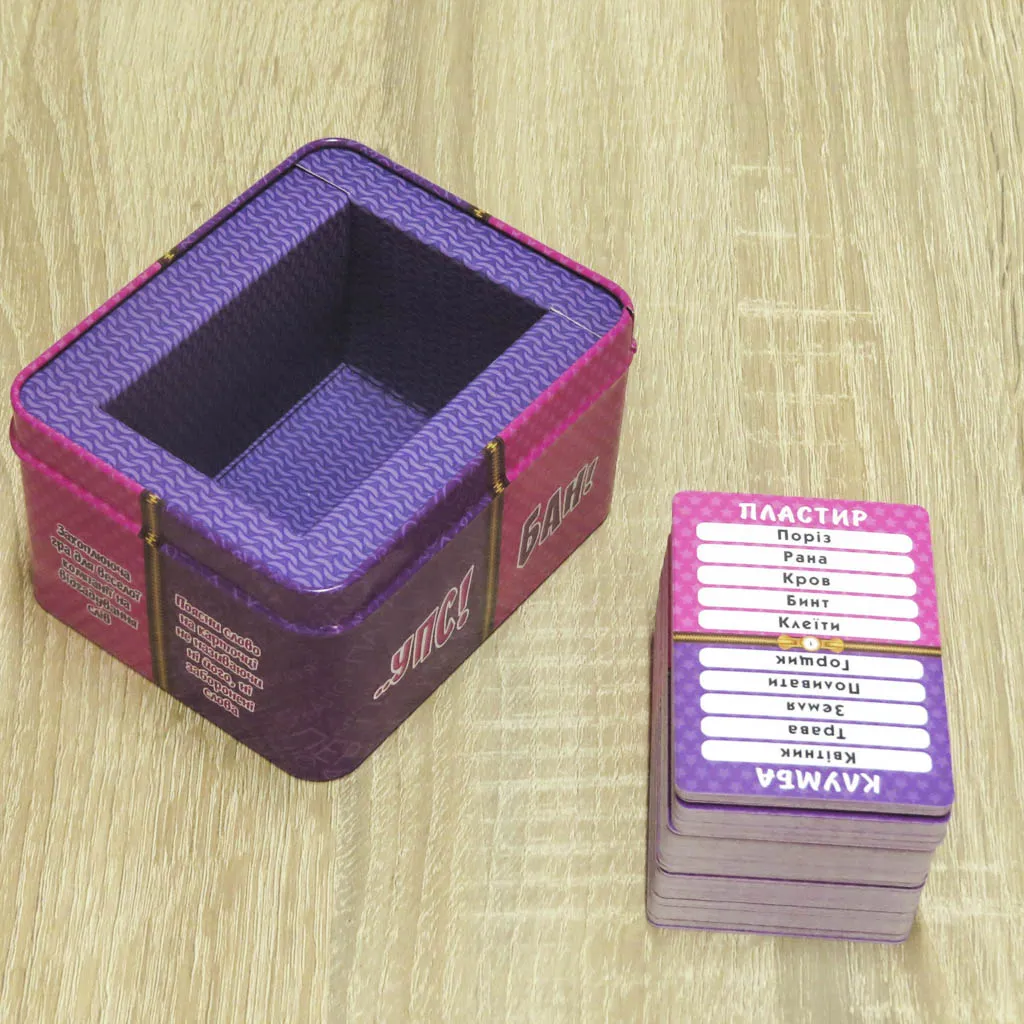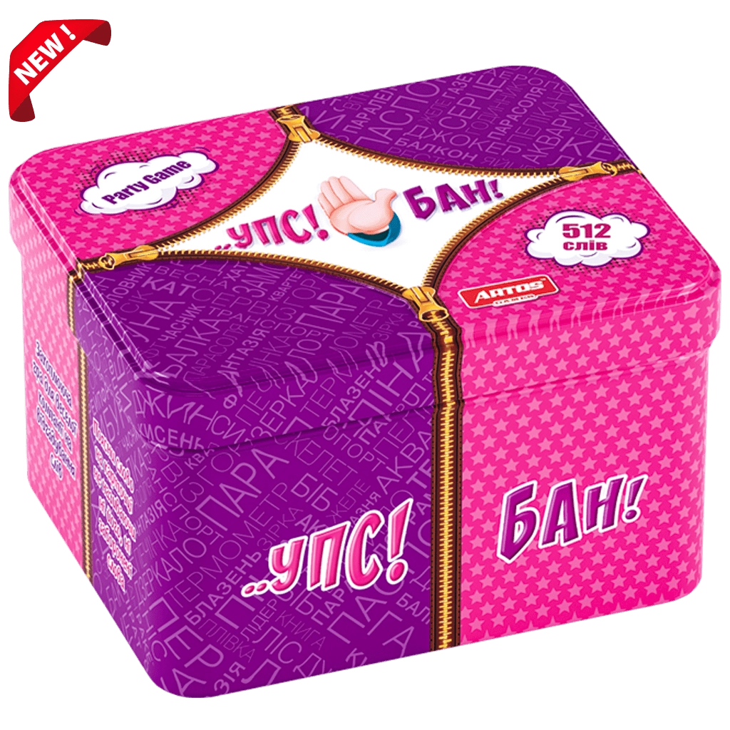 "Упс! Бан!" – захоплююча сімейна гра. Вам потрібно на швидкість пояснити слово на карточці, не називаючи ні його, ні інших 5 слів, що на ній вказані. Це заборонені слова. На пояснення та відгадування слів командам відводиться 1 хвилина. Комплектація: - 128 карт; - правила гри.