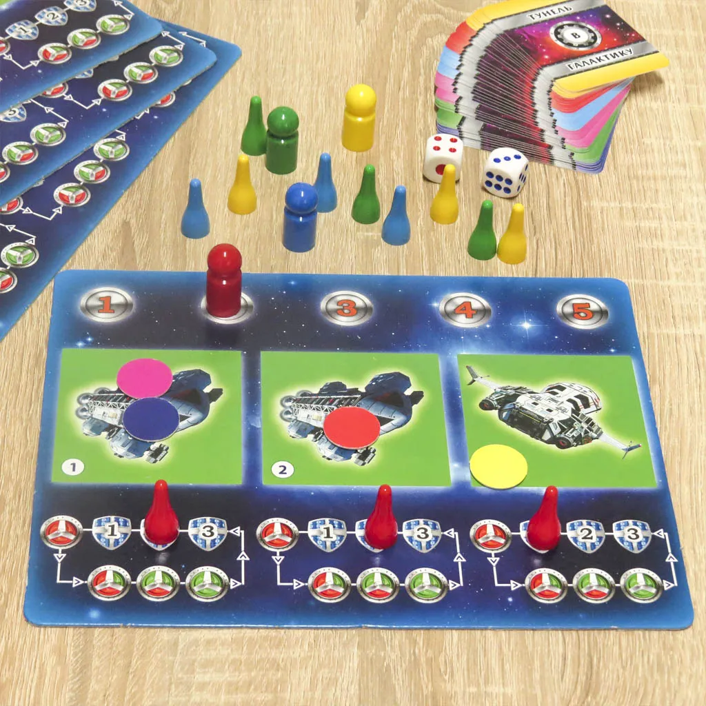 «Тунель в галактику» – цікава настільна стратегічна гра. Вона надасть Вам змогу проявити свої розумові здібності, стратегічне та логічне мислення. Кожен гравець повинен буде прораховувати власні дії на декілька ходів вперед. Протягом гри учасники будуть відвідувати планети у різних галактиках. Збирати на них ресурси, необхідні для виконання місій. У ході гри Ваші кораблі вступатимуть в бої з суперниками та отримуватимуть пошкодження від метеоритів. Завдяки гіперпаливу Ви зможете здійснювати стрибки через просторово-часові портали (космічні тунелі). Кораблі гравців будуть потрапляти у Чорну Діру, внаслідок чого вони можуть опинитись у будь-якому куточку Всесвіту. Для перемоги у грі необхідно виконати 5 місій. Хто першим досягне цієї мети, той і переможе у грі. Все це дозволить Вам весело й з азартом провести час. Комплектація гри: - Ігрове поле – 1 шт. - Ігровий планшет – 4 шт. - Карточки місій – 36 шт. - Космічні кораблі – 12 шт. - Фішки планетних ресурсів – 36 шт. - Фішки ресурсів – 72 шт. - Фішки пального – 60 шт. - Фішки гіперпального – 24 шт. - Фішки-маркери – 16 шт. - Кубик – 2 шт. - Правила гри.