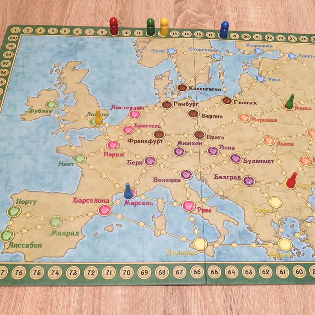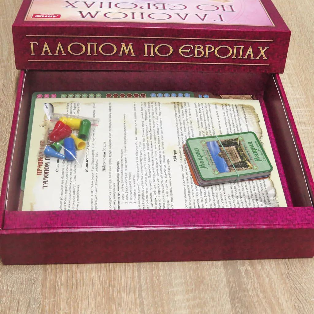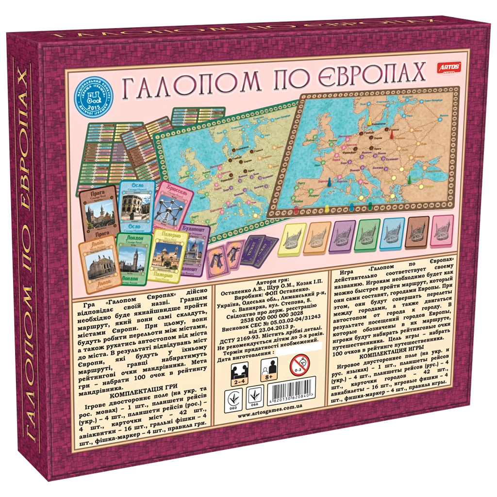 Гра «Галопом по Європах» дійсно відповідає своїй назві. Гравцям необхідно буде якнайшвидше пройти маршрут, який вони самі склали, містами Європи. При цьому вони будуть робити перельоти між містами, а також рухатись автостопом від міста до міста. В результаті відвідувань міст Європи, які будуть в їхньому маршруті, вони набирають рейтингові очки мандрівника. Мета гри – набрати 100 очок в рейтингу мандрівника. Комплектація гри: - Ігрове двостороннє поле – 1 шт. - Гральні фішки – 4 шт. - Фішка-маркер – 4 шт. - Карточки міст – 42 шт. - Авіаквитки – 16 шт. - Планшети рейсів на укр. мові – 4 шт. - Планшети рейсів на рос. мові – 4 шт. - Правила гри.