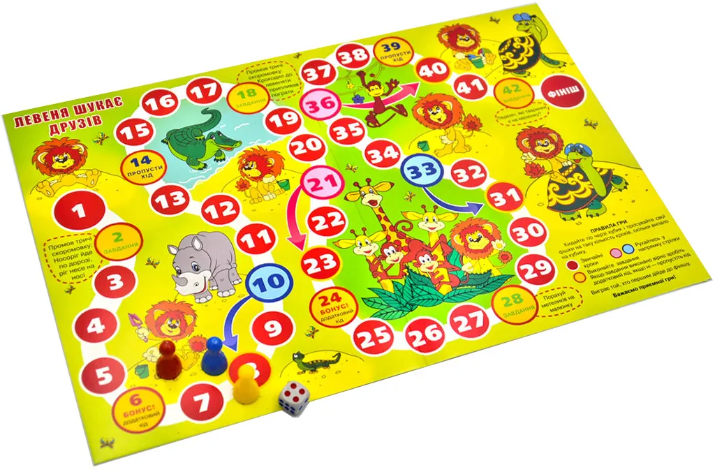 Пропонуємо Вам збірник захоплюючих логічних ігор для малюків за мотивами казки чудового дитячого письменника Сергія Козлова про веселого Левеня та його друзів. До збірки входять: 1. Настільна гра-бродилка "Левеня шукає друзів", в якій потрібно допомогти Левеняті знайти собі друзів. Кидайте кубик і просувайте фішки по ігровому полю, виконуючи цікаві завдання. Виграє той, хто першим виконає всі завдання і дійде до фінішу. 2. Настільна логічна гра-пазл для найменших "Левеня і Черепаха", в якій ігрове поле розбито на 24 частини, з яких потрібно скласти цілу картинку. Ігри дозволять весело провести час, розважаючись з друзями, покращити комунікативні і розумові навички, уважність, кмітливість, пам'ять і дикцію, допоможуть вивчити африканських тварин, цифри, навчитися рахувати, зіставляти окремі елементи за формою, кольором, розміром, складати з частин ціле, розвинуть образне і логічне мислення, просторову уяву, сприйняття, дрібну моторику рук. Комплектація: 1. Гра-бродилка "Левеня шукає друзів": ігрове поле (340 х 220 мм), 3 фішки, 1 кубик. 2. Гра-пазл "Левеня і Черепаха": 420 х 300 мм, 24 елементи (з картону товщиною 2 мм).