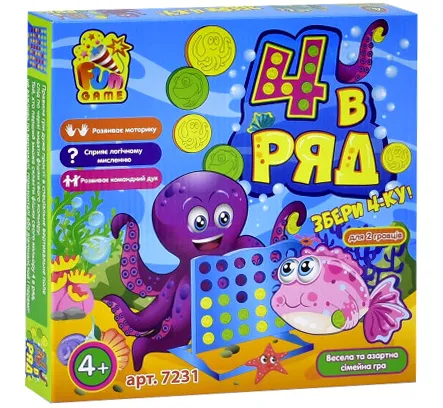 Пропонуємо Вашій увазі своєрідну альтернативу «хрестикам і нуликам», але у багато разів більше цікаву гру «4 в ряд»! Проста, але одночасно дуже захоплююча гра для 2-х чоловік підійде як для дітей, так і для дорослих. Сенс «4 в ряд» полягає в тому, щоб першим зібрати 4 фішки свого кольору в будь-якому напрямку: по вертикалі, горизонталі або діагоналі. Весела і азартна сімейна гра надасть багато годин цікавого проведення часу в тісному сімейному колі. Завдяки пропонованій іграшці діти зможуть розвинути в собі здоровий дух суперництва, а також покращити логічне мислення, продумуючи ходи наперед. Комплектація: ігрова решітка-основа, 21 червона фішка, 21 жовта фішка.