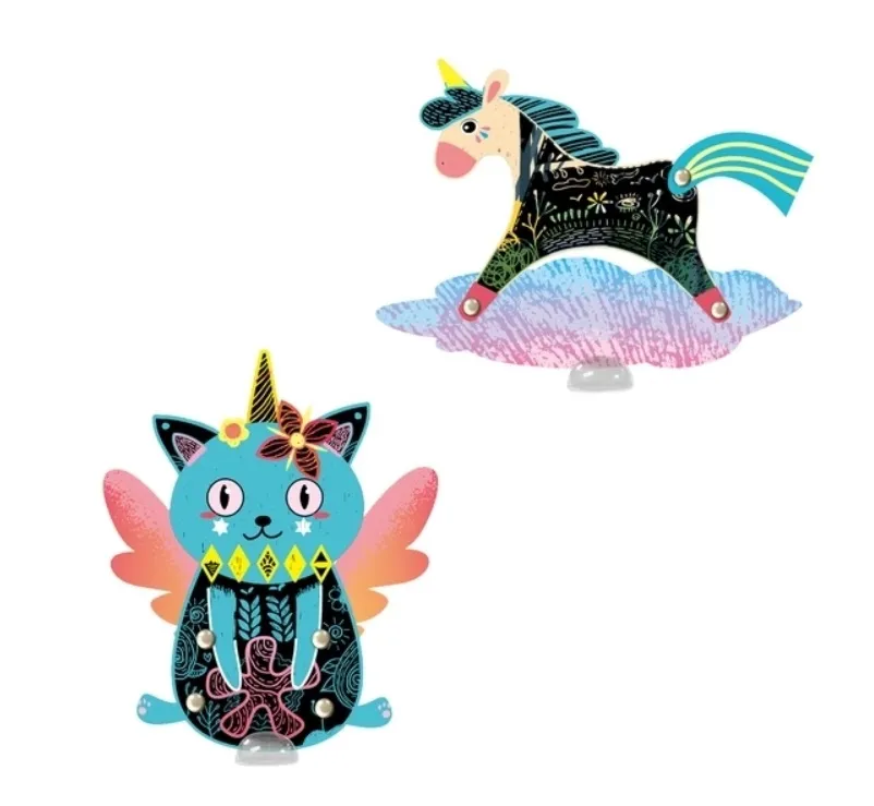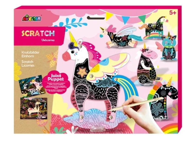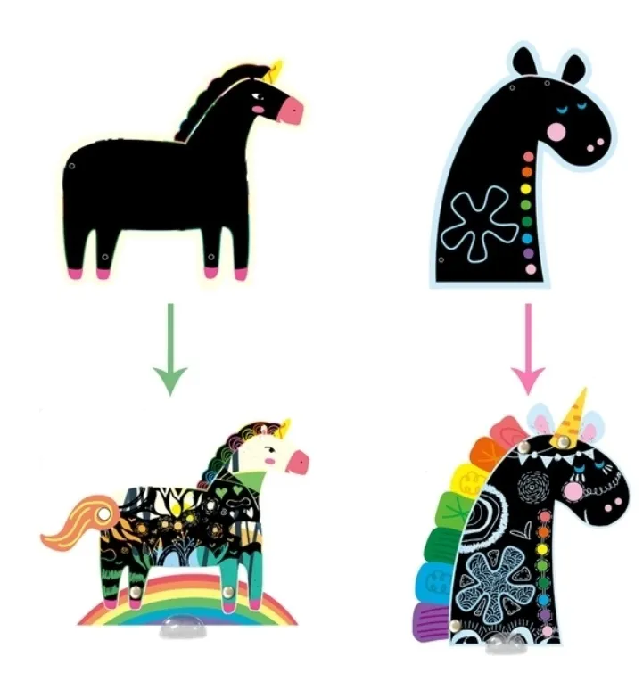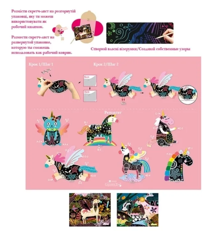- дряпайте скретч-листи спеціальним олівцем, малюйте, розфарбовуйте деталі та створіть чарівних єдинорогів