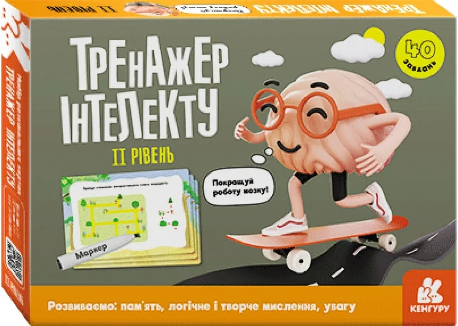Тренажер інтелекту Рівень II — це набір карток із вправами для тренування уваги, сприйняття, пам'яті, мислення і взаємодії півкуль головного мозку. Нейропсихологічні вправи побудовано за корекційно-розвивальною методикою на базі авторських розробок корекції і розвитку когнітивних функцій мозку.Картки допоможуть дитині в ігровій формі розвинути увагу, логічне мислення, творчі здібності й інтелект. Вправи мають різні рівні складності та корисні в будь-якому віці. У людей старшого віку відбувається інтенсифікація розумових процесів, підвищується стійкість уваги і пам'яті, гострота мислення, що сприяє збереженню здоров'я і довголіття. Поступове ускладнення завдань стимулює розвиток функцій мозку.Комплекс тренувальних вправ розроблено і схвалено командою нейропсихолотів, логопедів та інших спеціалістів, які працюють з дітьми з особливими освітніми потребами.