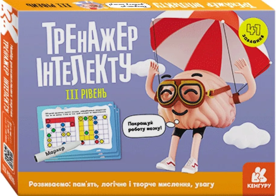 Тренажер інтелекту Рівень III — це набір карток із вправами для тренування уваги, сприйняття, пам'яті, мислення і взаємодії півкуль головного мозку. Нейропсихологічні вправи побудовано за корекційно-розвивальною методикою на базі авторських розробок корекції і розвитку когнітивних функцій мозку.Картки допоможуть дитині в ігровій формі розвинути увагу, логічне мислення, творчі здібності й інтелект. Вправи мають різні рівні складності та корисні в будь-якому віці. У людей старшого віку відбувається інтенсифікація розумових процесів, підвищується стійкість уваги і пам'яті, гострота мислення, що сприяє збереженню здоров'я і довголіття. Поступове ускладнення завдань стимулює розвиток функцій мозку.Комплекс тренувальних вправ розроблено і схвалено командою нейропсихолотів, логопедів та інших спеціалістів, які працюють з дітьми з особливими освітніми потребами.