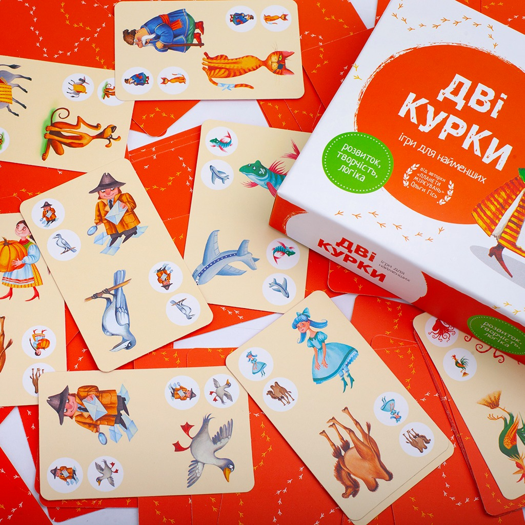 Настільна гра для маленьких Дві курки | Дві курки. ТАКА МАКА Розвиваюча гра з ілюстраціями від автора підручників щодо розвитку логічного та творчого мислення «Планета міркувань» Ольги Гись. Гра розвиває увагу, зорову пам'ять та реакцію. Мета гри – скинути всі картки, які мають однаковий малюнок із картою на столі. Ілюстрації красиві та яскраві!