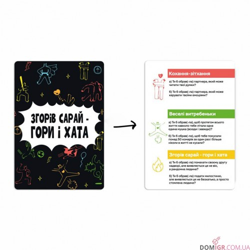 Готові до непередбачуваних пригод та несподіваних виборів? Згорів сарай - гори і хата (укр.) – це вибуховий коктейль із гумору, інтриги та нестандартних рішень. Зустрічайте ваших друзів у світі, де будь-яка картка – це загадка, здатна повернути все з ніг на голову. Відкривайте нові грани порозуміння і дізнавайтеся у своїх близьких про те, про що раніше не замислювалися. Згорить сарай? Нехай горить і хата - адже саме так по-справжньому весело!