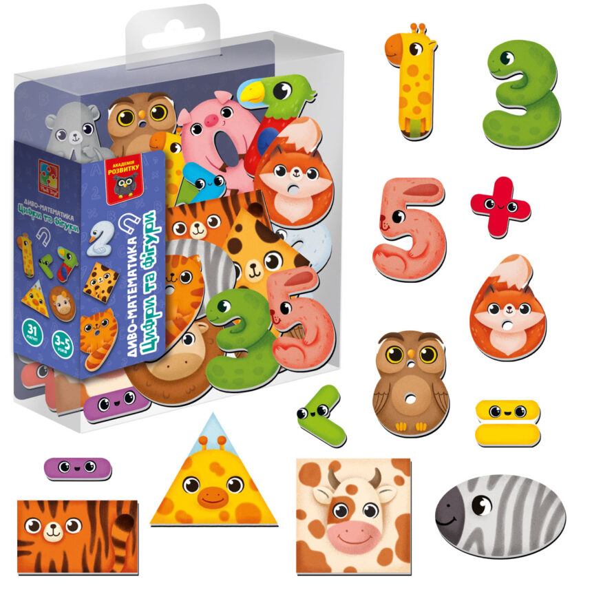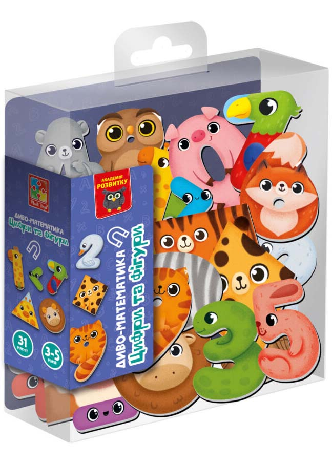 З прозорої коробки виглядають кумедні персонжі, це диво-математика запрошує малечу до першого знайомства. Розвиваюча магнітна гра Vladi Toys включає цифри та геометричні фігури у вигляді милих звіриків. Зацікавленість гарантовано!