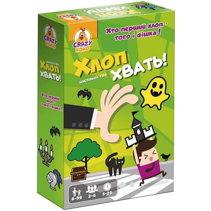 Хто перший «Хап» — того і картка! Пропонуємо приєднатися до цікавої динамічної гри та провести час весело. Швидше клич друзів, і шукайте збіги на своїх картках і на картці із загальної купки! Якщо хтось побачив збіг першим — він хапає картку собі. Переможе той, хто збере найбільше карток.