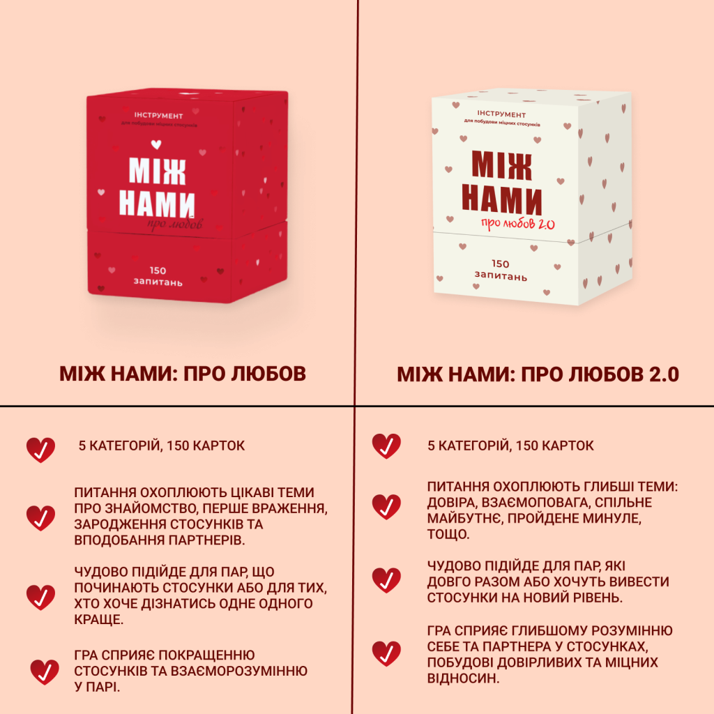 Між нами: Про любов 2.0 – оновлена версія улюбленої карткової гри для пар, створена, щоб поглибити емоційний зв'язок та зміцнити довіру між партнерами. У цій версії на вас чекають 150 нових запитань, які допоможуть відкрито говорити про найважливіші аспекти стосунків, розкрити ваші почуття та краще зрозуміти одне одного.