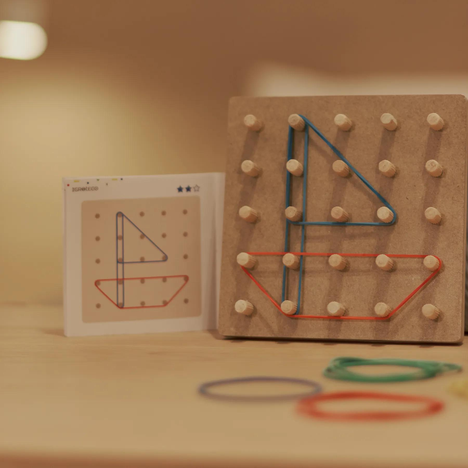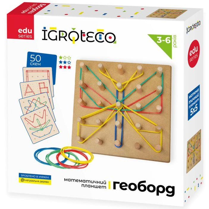 Геоборд (geoboard) — це універсальна геометрична дошка, призначена для створення плоских зображень, відома також як дошка для натягування резиночок. Ця унікальна розвивальна еко-іграшка ідеально підходить для навчання та відпочинку водночас.
