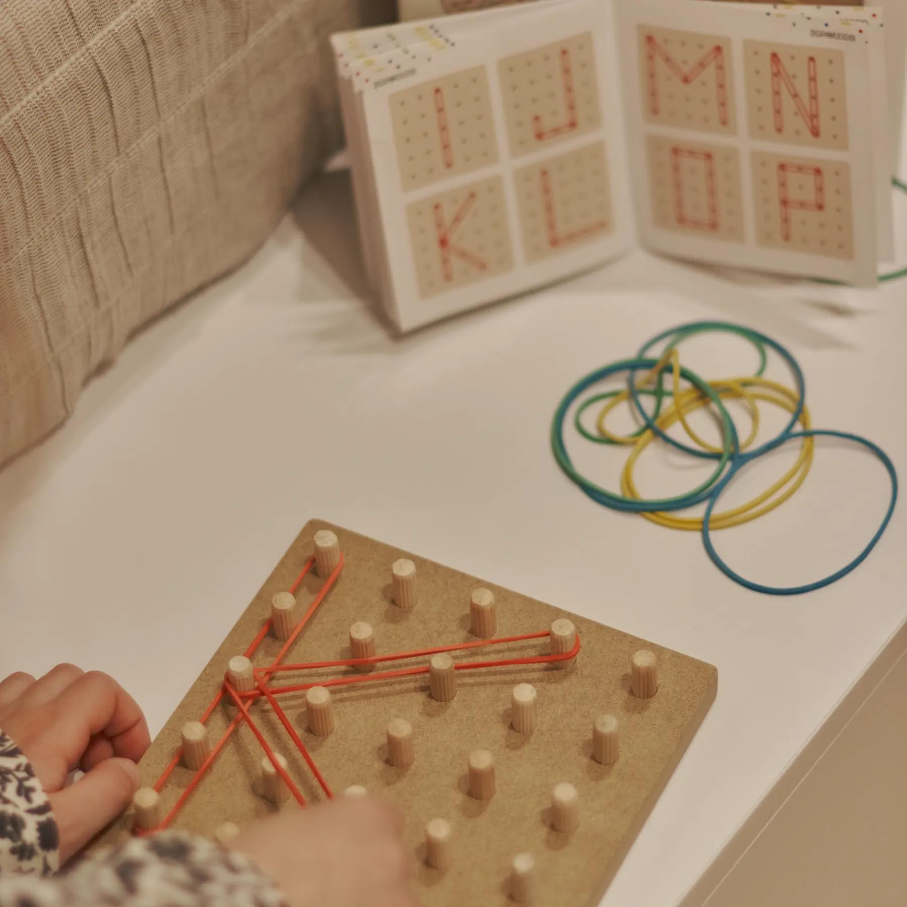 - дрібної моторики, адже натягування гумок вимагає точності рухів і слугує своєрідним масажем для пальців та рук дитини