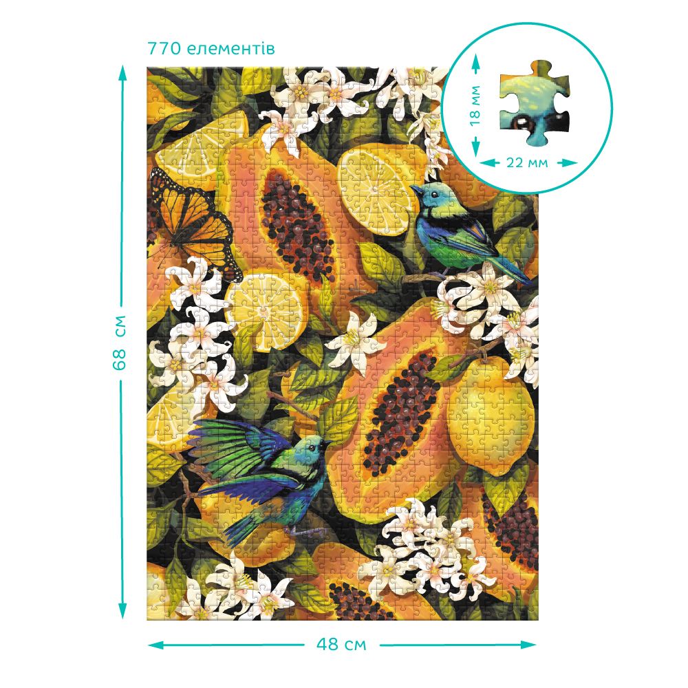 Цей пазл стане чудовим тренуванням для уваги, терпіння та посидючості, які дуже важливі для навчання. Він також дасть можливість насолодитися естетикою тропічних фруктів і створить атмосферу тепла і радості.