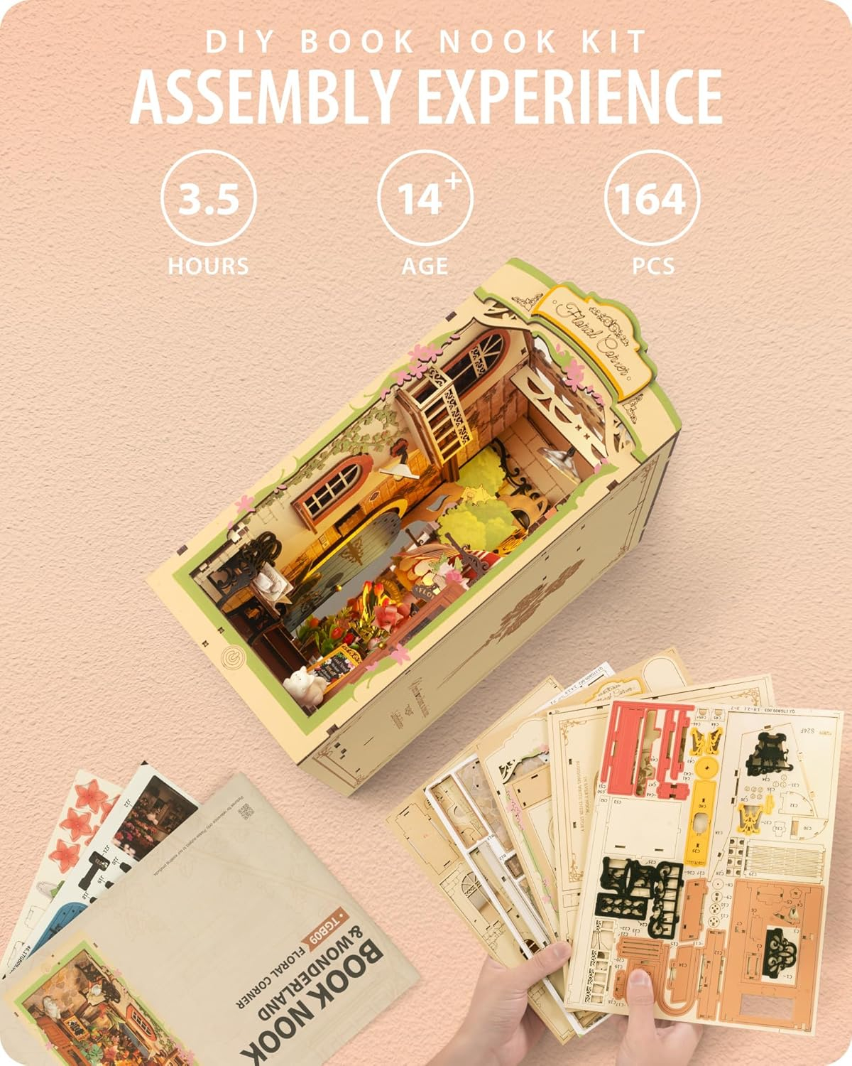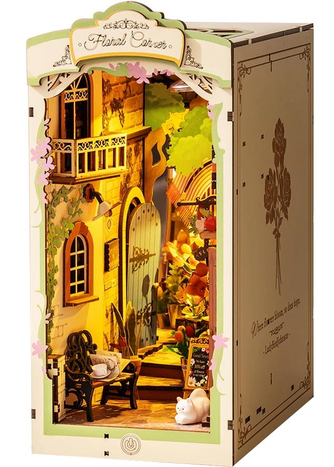 Book Nook Robotime Rolife Flower Corner стане чудовим подарунком для близьких на такі свята, як День матері, День батька, Різдво або День народження. Його можна використовувати як нічник, полицю-декор чи книжкову заставку. Легка і зрозуміла інструкція, зручна конструкція та м’яке підсвічування роблять з цього набору ідеальний варіант для релаксації після роботи.